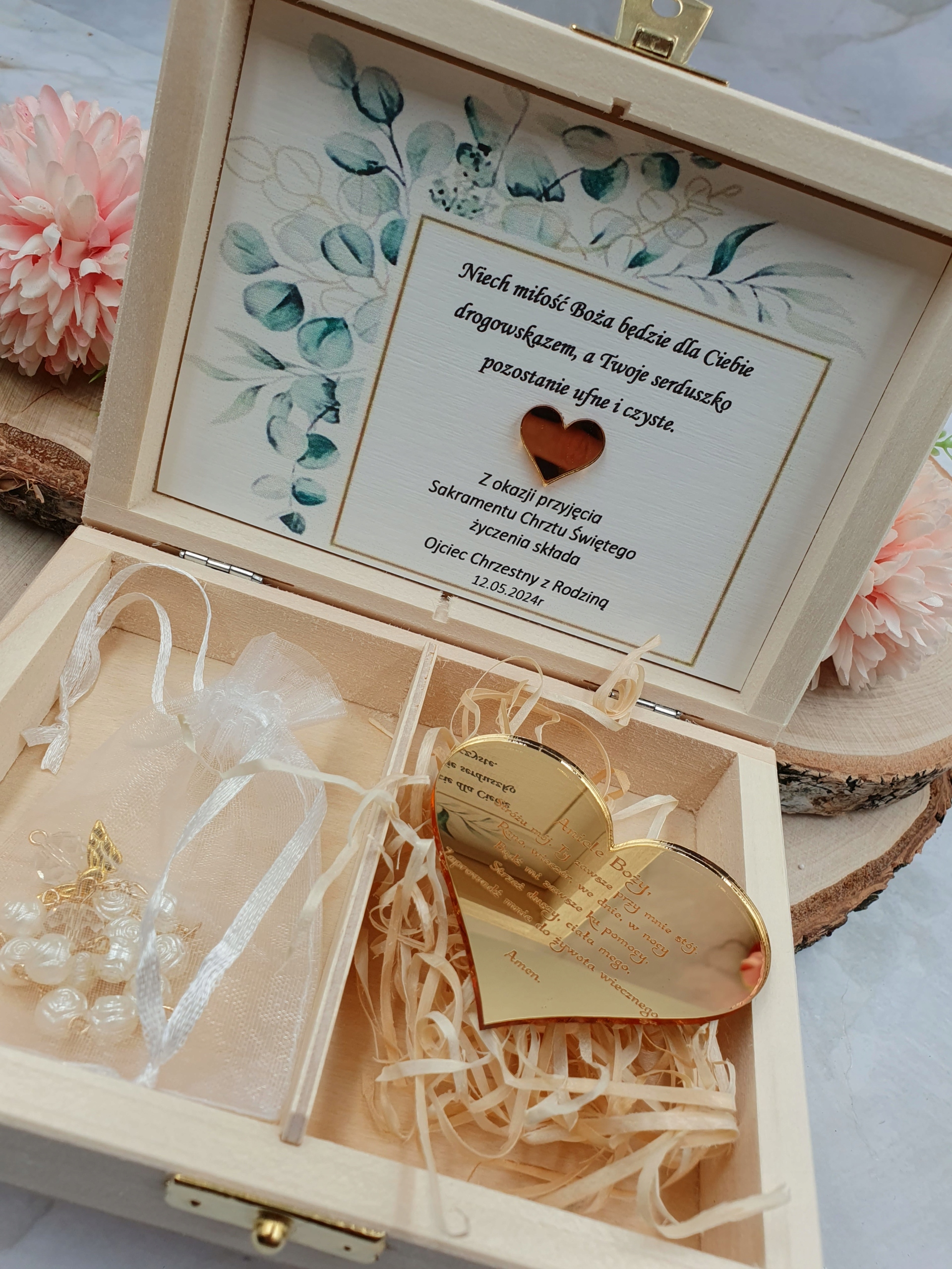 Pamiątka Chrztu Świętego-PREZENT pudełko. Różaniec i serduszko komplet