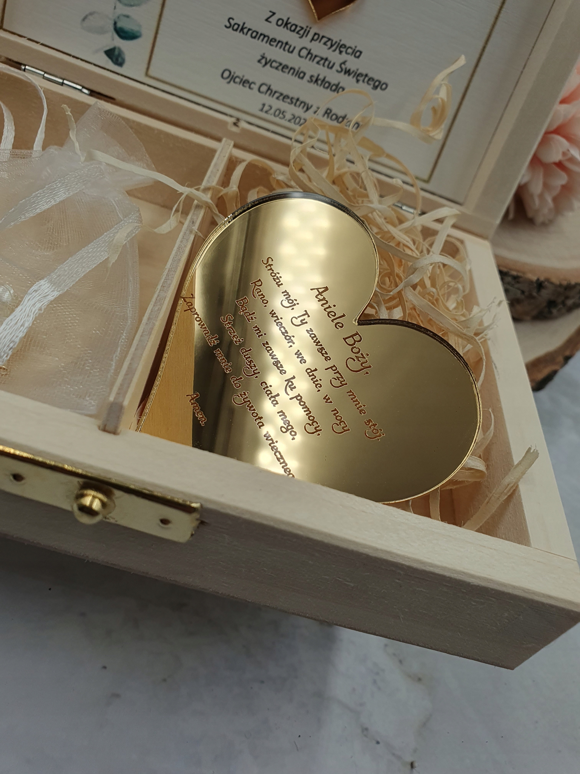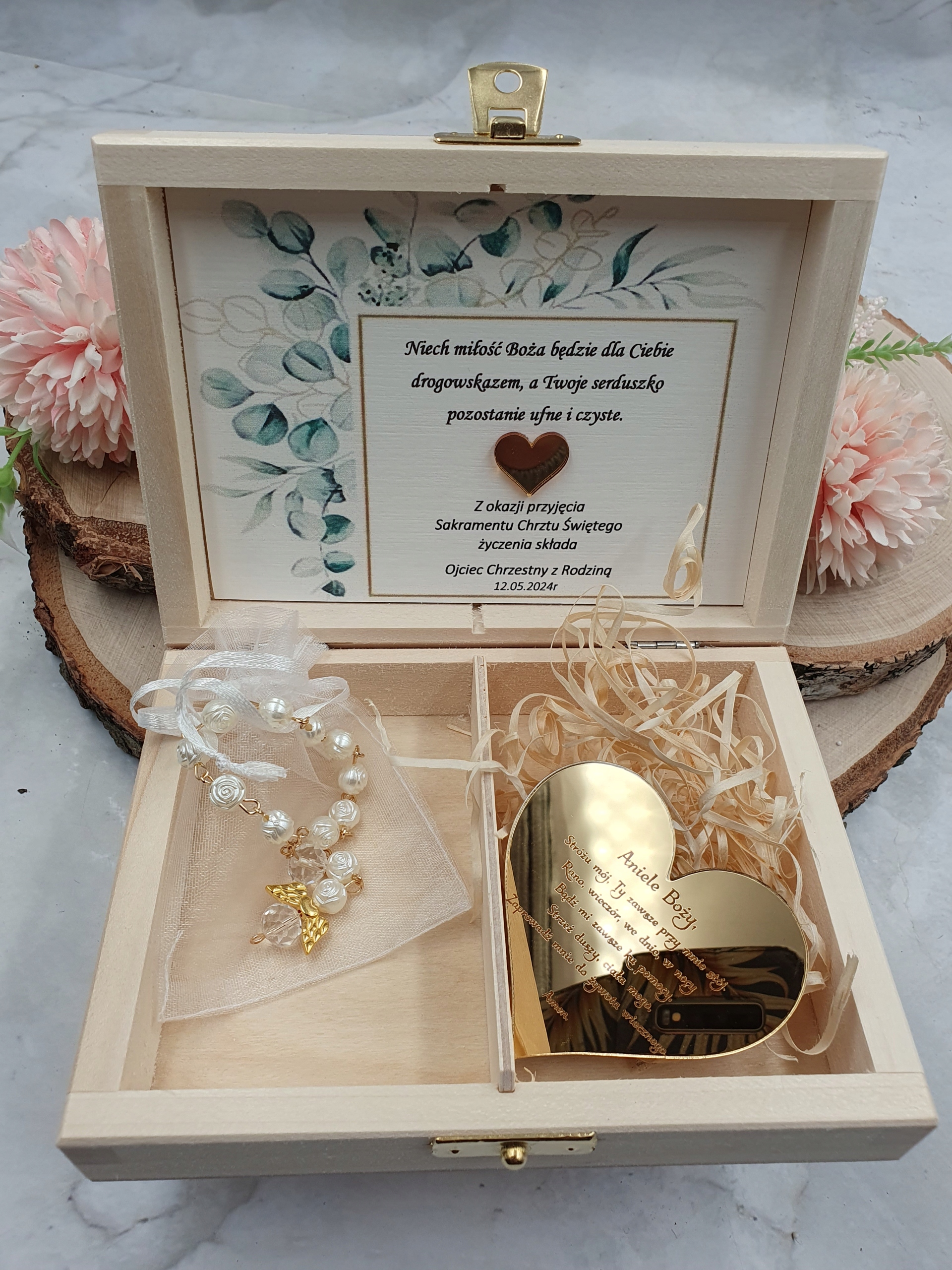 Pamiątka Chrztu Świętego-PREZENT pudełko. Różaniec i serduszko komplet