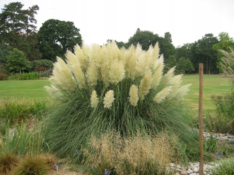 Трава Пампаса-це дуже велике, незграбне багаторічне, листя якого досягають 1-2 м, а постріли суцвіття ростуть до 2-3 м у висоту. Більшу частину сезону його прикраса - це густа грудка листя, висить на вулиці і утворює "зелений фонтан". Листя вузькі, жорсткі і покриті по краях невеликими гострими зубами, які в контакті зі шкірою можуть викликати роздратування або подряпини.