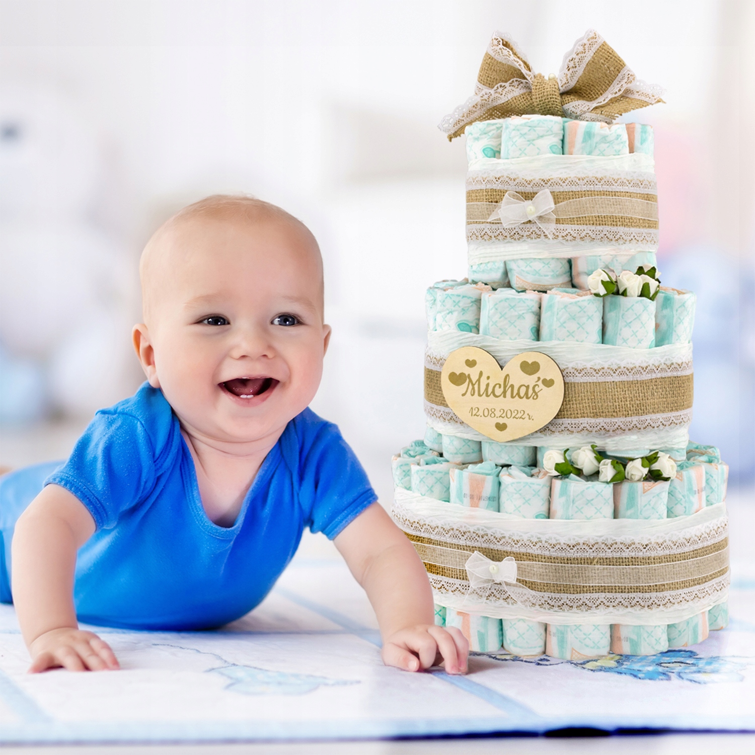 Унікальний торт для малюка, який складається з 59 пелюшок і дерев'яного сердечка з персоналізацією, є надзвичайно практичним подарунком на хрещення, і день народження дитиниабо свято дитини. Підгузки складені у формі багатоярусного торта, прикрашеного стрічками та бантами.