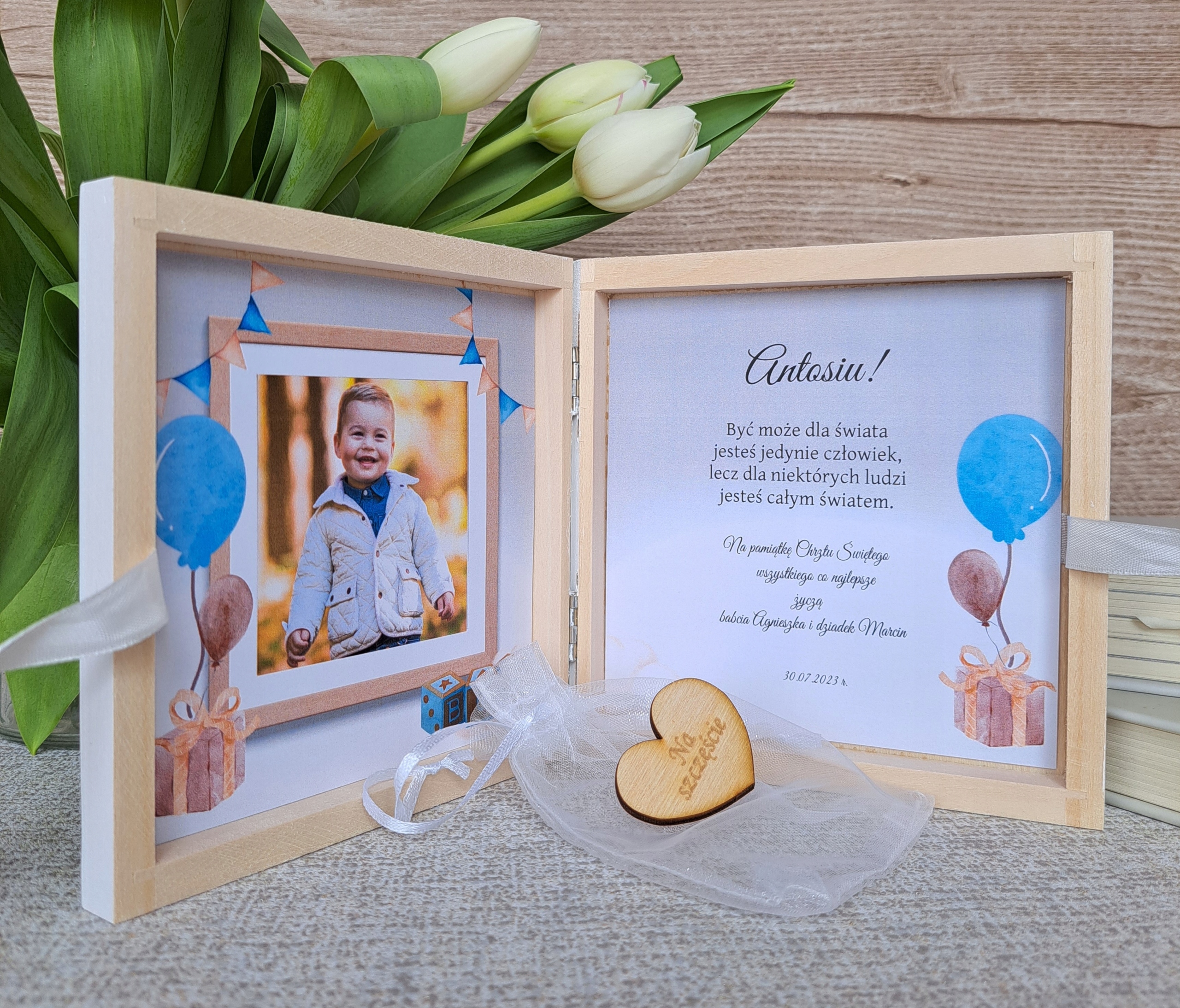 У коробці побажання та невеликий білий мішечок з органзи, куди можна покласти гроші, які ви хочете подарувати молодій людині на свято Хрещення.