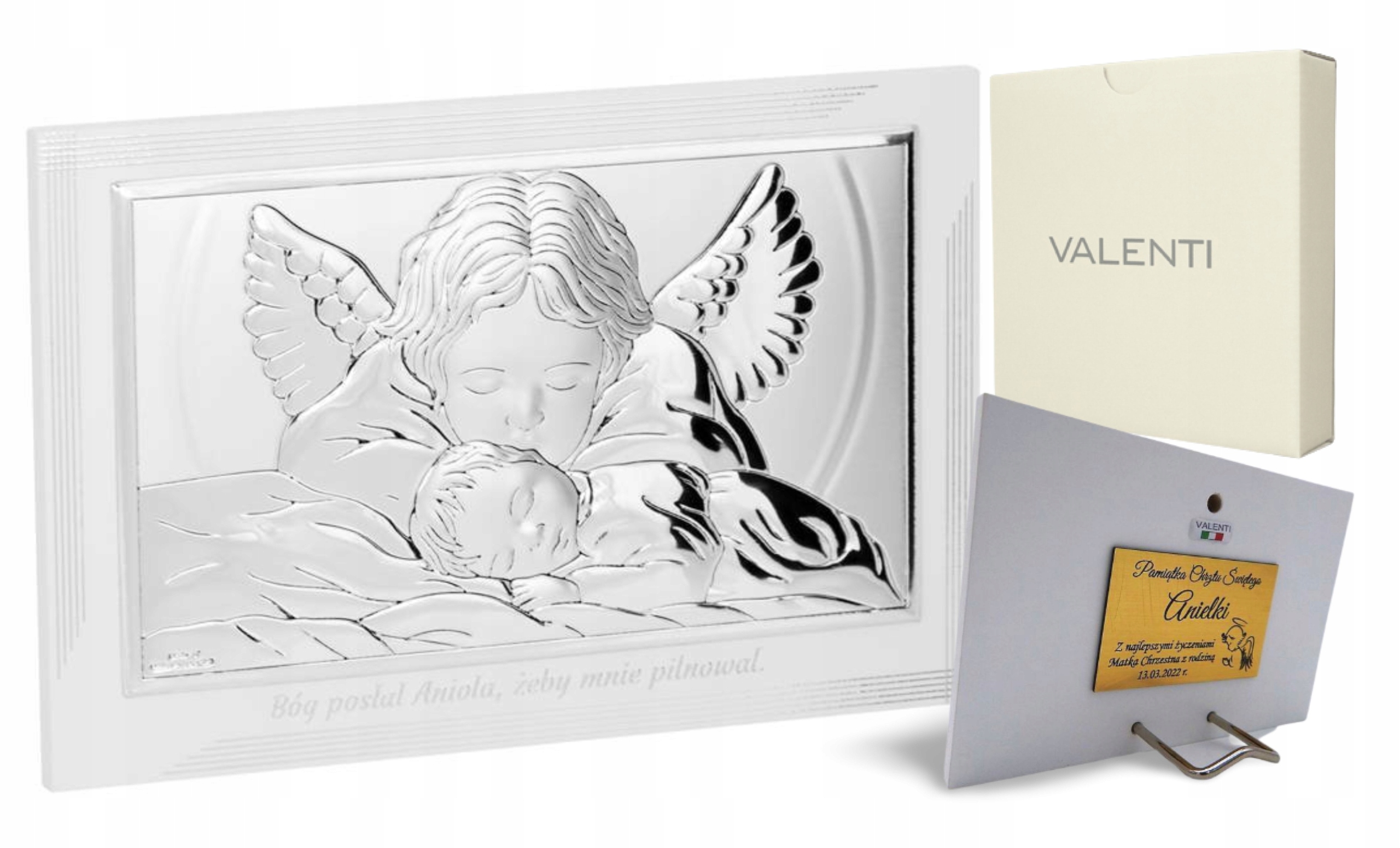 КАРТИНА - СУВЕНІЛ СВЯТОГО ХРЕЩЕННЯ, СВЯТОГО ПРИЧАСТЯ. АНГЕЛ НА БІЛОМУ ФЛІ З ГРАВІЮВАННЯМ. СРІБЛО 999.95.