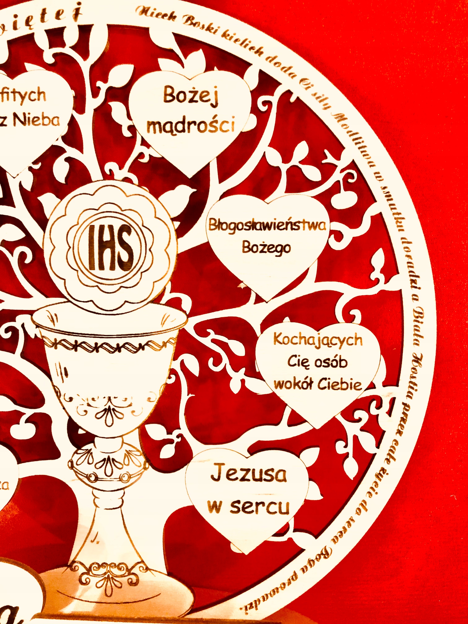 Чудове вигравіруване дерево щастя з фанери товщиною 3 мм, повністю виготовлене в нашій майстерні, спеціально адаптоване для нагоди Першого Святого Причастя.