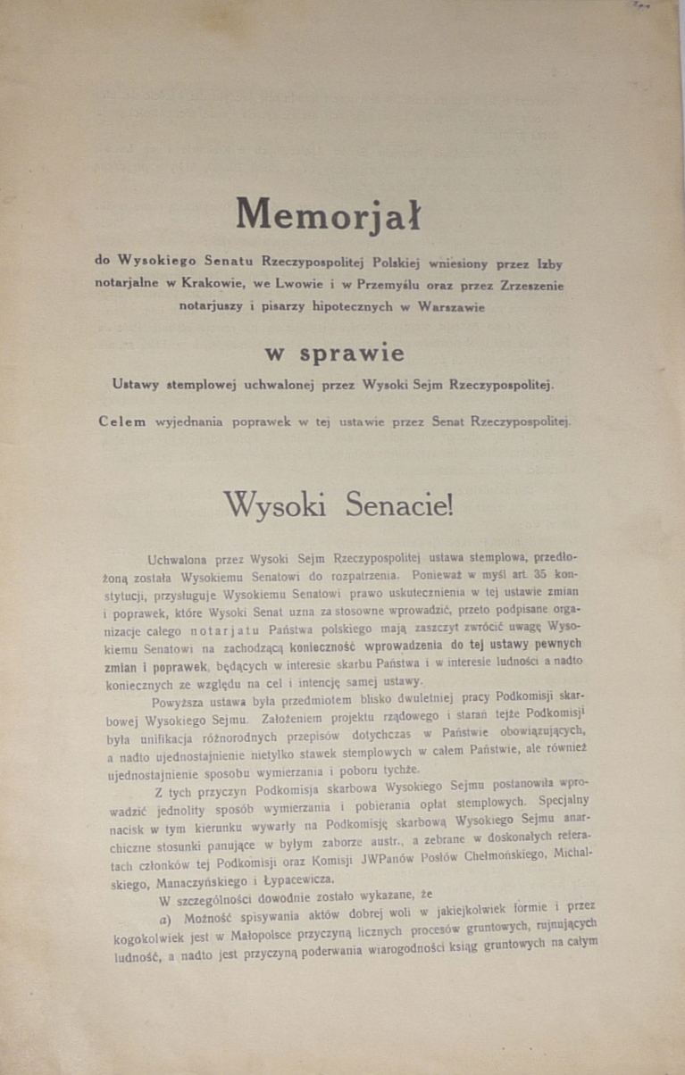 [ЮДАЇКА] «Меморіал Високому Сенату Республіки Польща поданий Нотаріальними палатами в Кракові, Львові та Перемишлі та Асоціацією нотаріусів та іпотечних виконавців у Варшаві щодо Закону про печатку, ухваленого Верховним Сеймом Республіки Польща З метою отримання поправок до цього акту від Сенату Республіки Польща.Стор.6 Меморіал супроводжувався 3-сторінковим текстом під назвою "Що важливіше?" Чи це інтереси держави і польського селянина, чи інтереси «обраного народу»? Формат 22 х 33,5 см, друк і літографія P.F. "Jan Cotty" у Варшаві. Хороший стан, природно злегка пожовклий папір.[ NOTARIAT ] [ JUDAICA ] [ II RP ][ REVENUE ] 102B