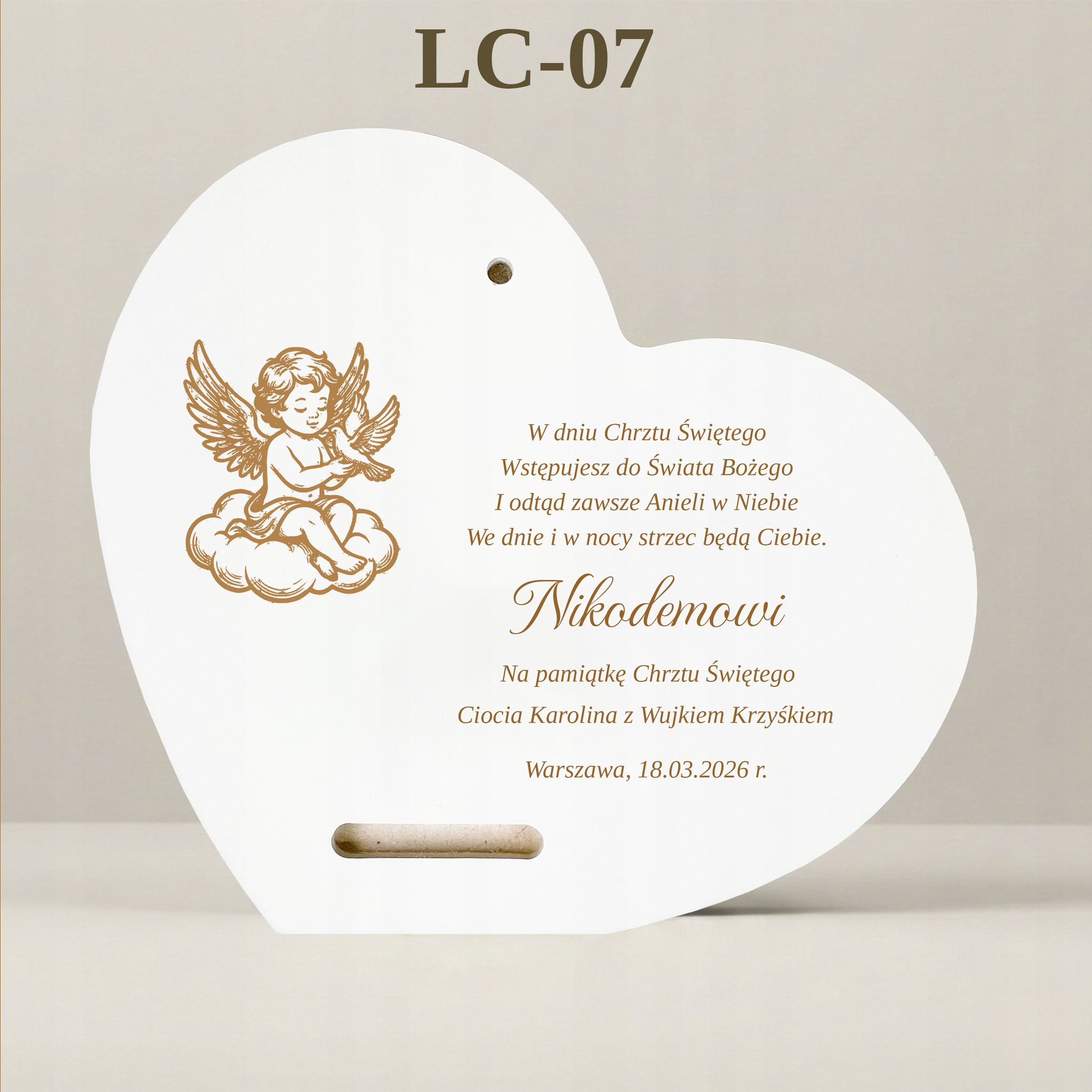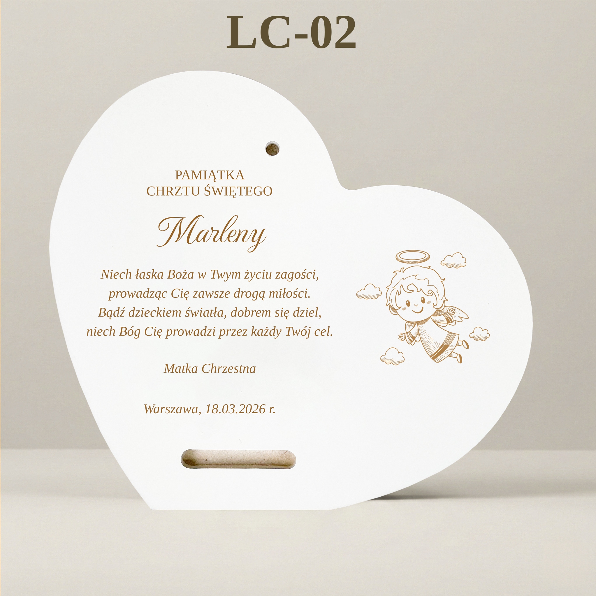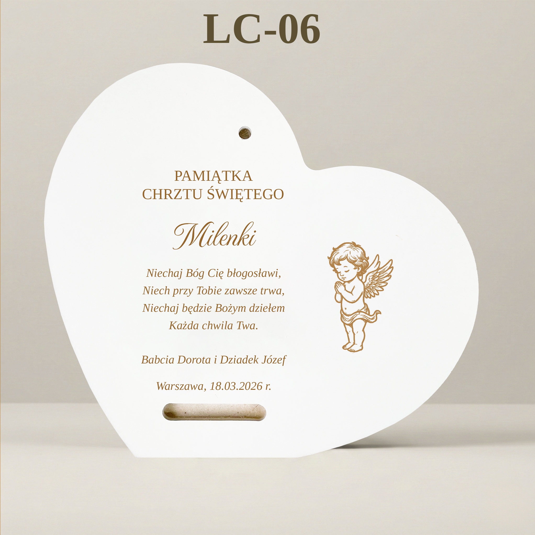Сцена, представлена на картині, сповнена тепла та спокою. Ангел-охоронець стежить за сном малюка. Форма серця додатково підкреслює любов, якою дитину оточують батьки та хресні. На нижньому краю вишуканий, стилізований напис: "Сувенір на Святе Хрещення".