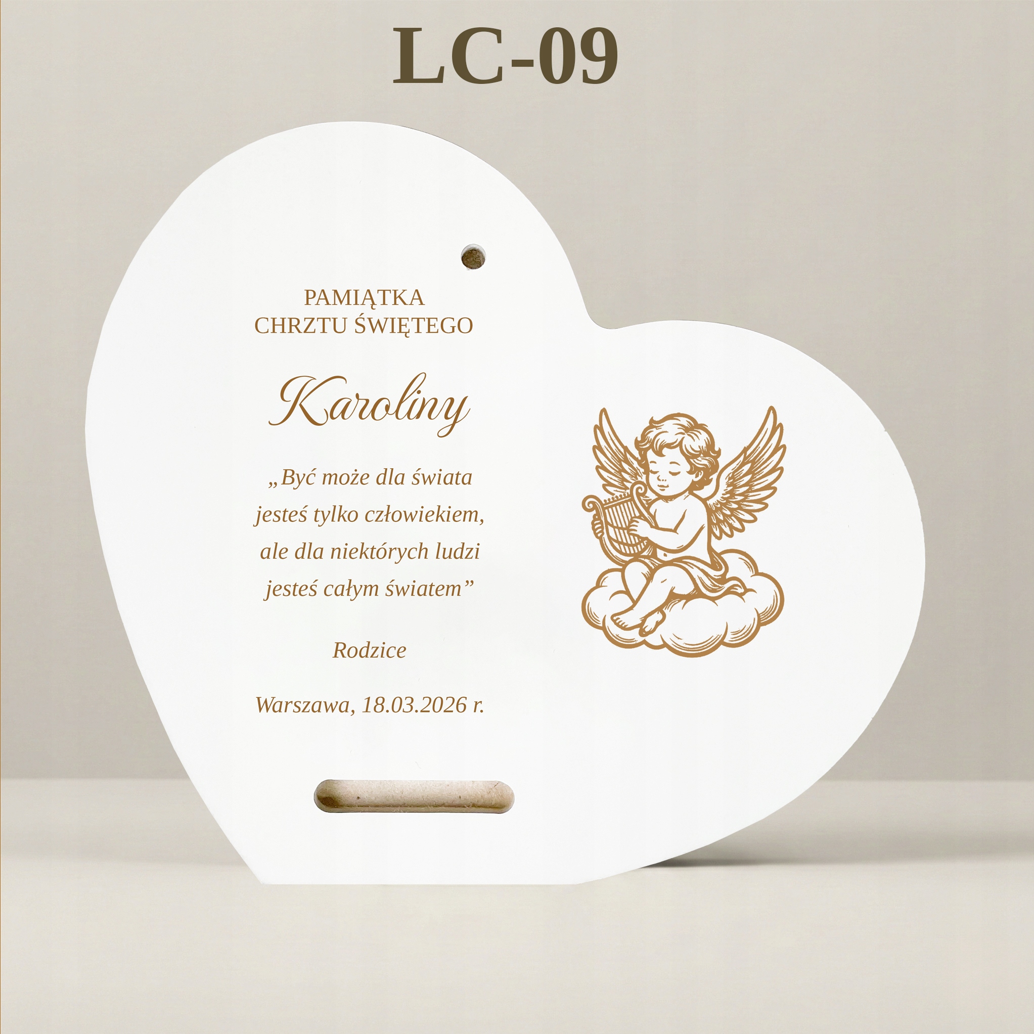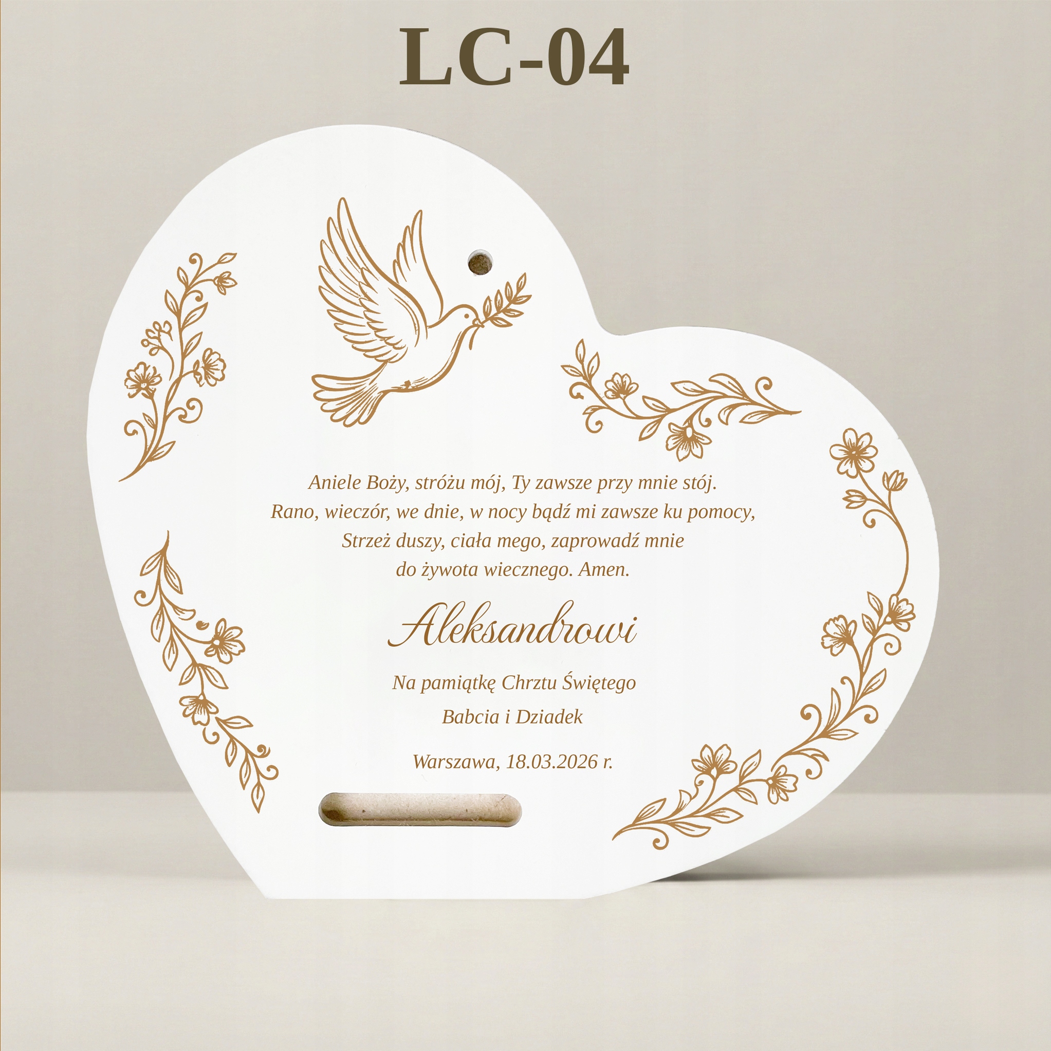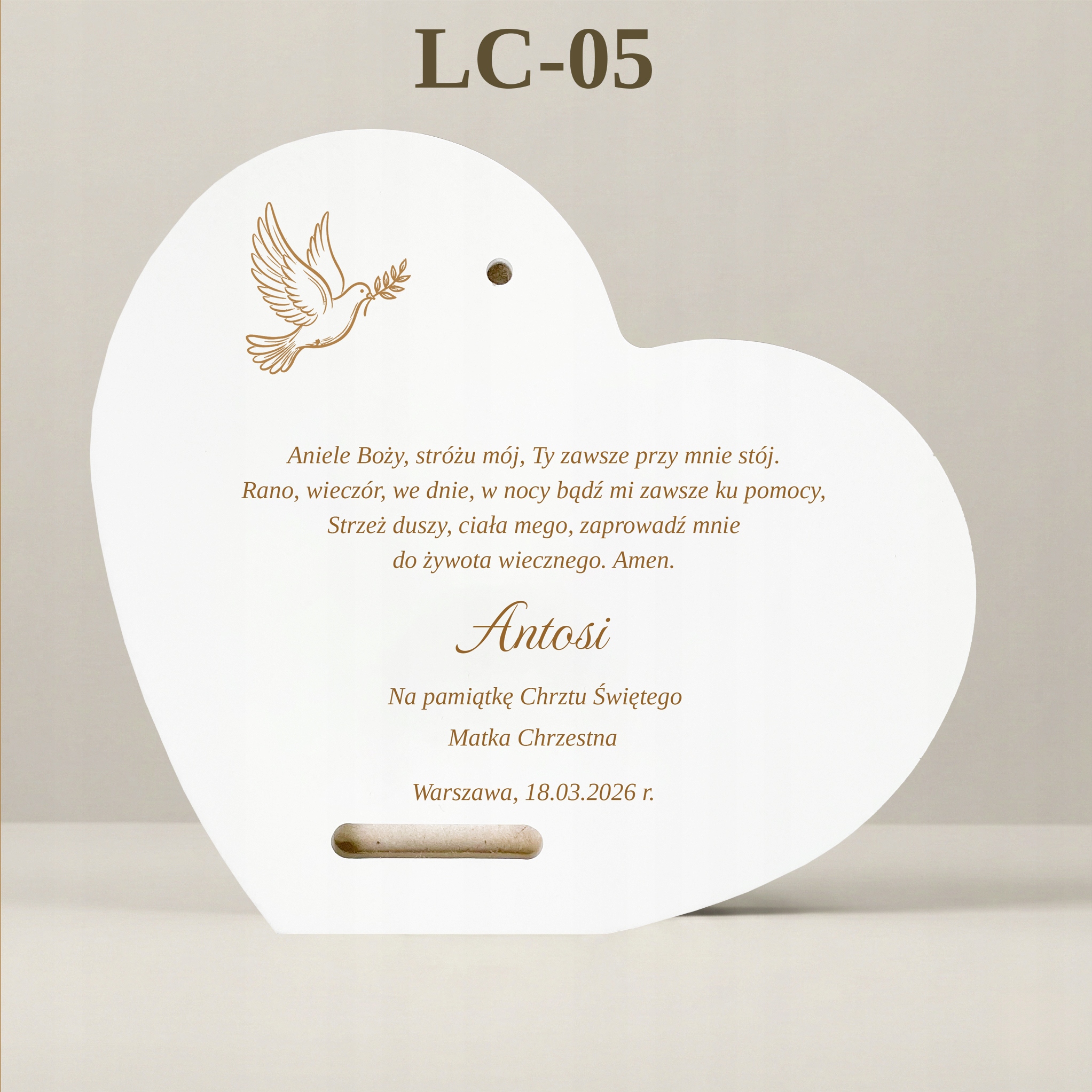 Сцена, представлена на картині, сповнена тепла та спокою. Ангел-охоронець стежить за сном малюка. Форма серця додатково підкреслює любов, якою дитину оточують батьки та хресні. На нижньому краю вишуканий, стилізований напис: "Сувенір на Святе Хрещення".