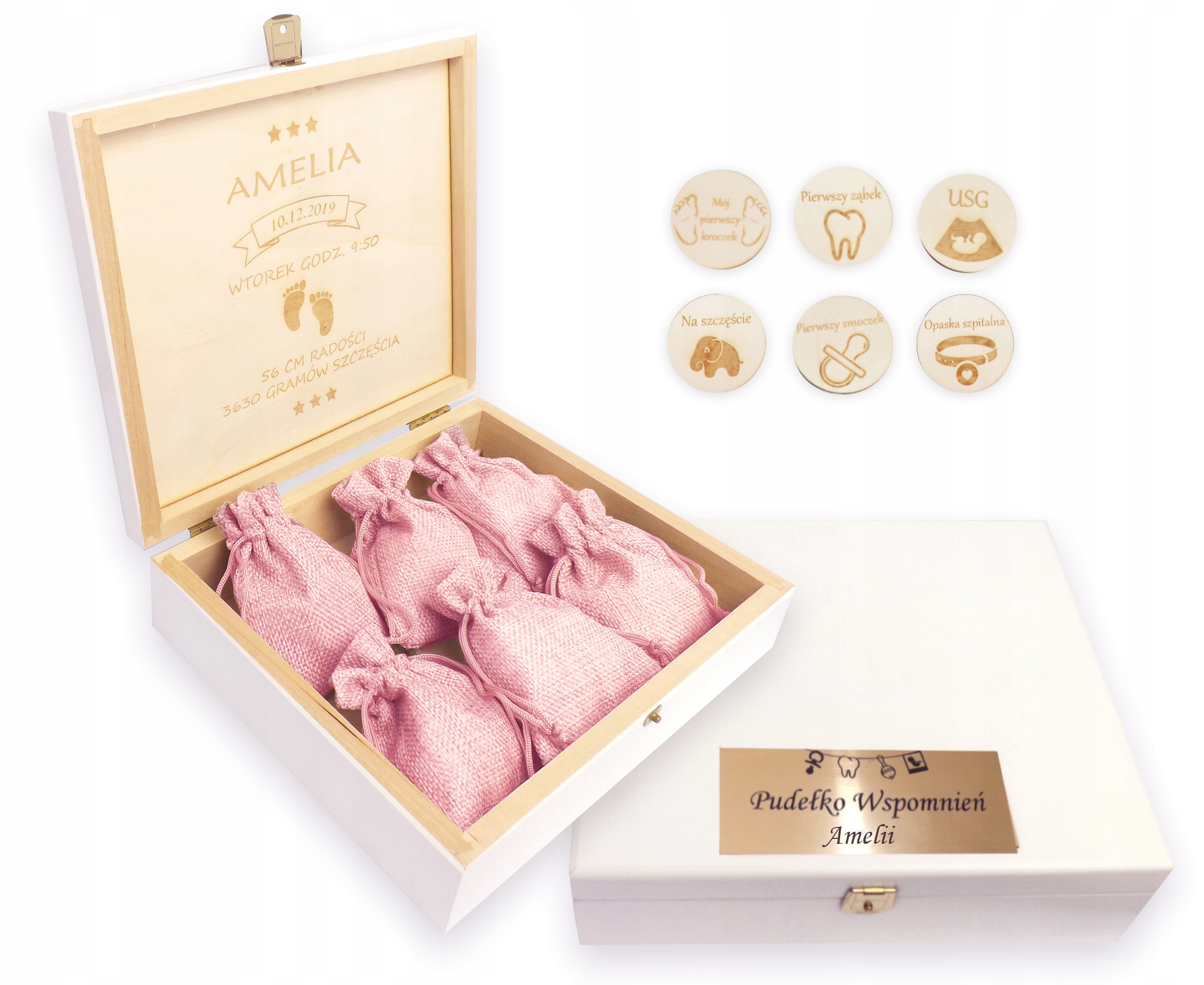 Всередині коробки зроблено гравіювання з датою. ., щодо найважливішоїінформації з нагодинародження дитини та на зовнішній стороні єім'я дитини разом із зображенням.