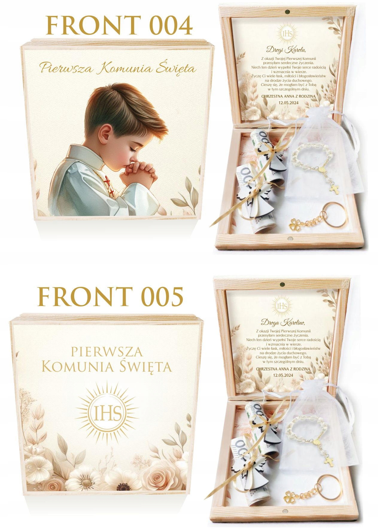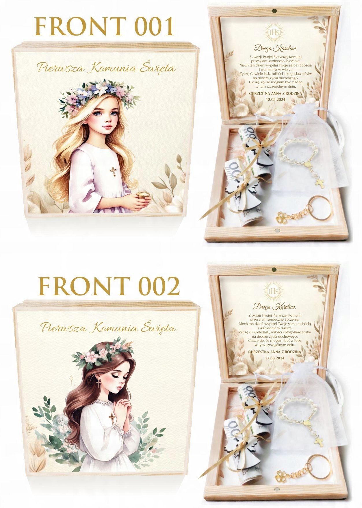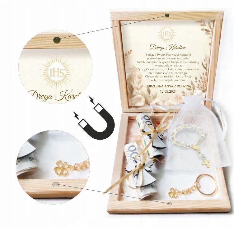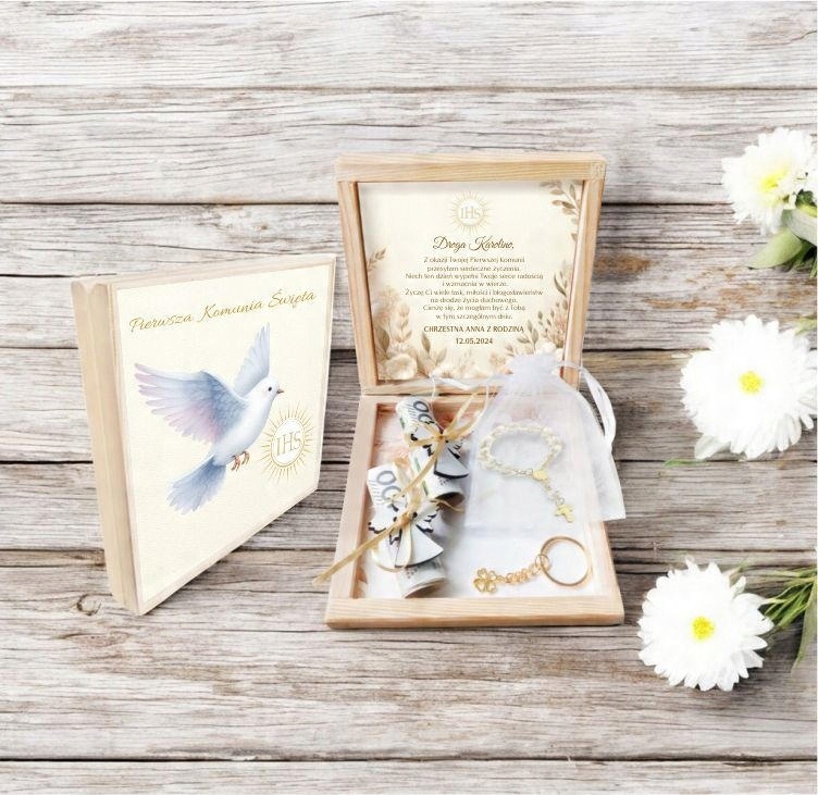 Наша дерев’яна коробка — ідеальний подарунок від родина, куми та гості. Він неодмінно служитиме одержувачам роками як практична форма зберігання сувенірів для причастя.