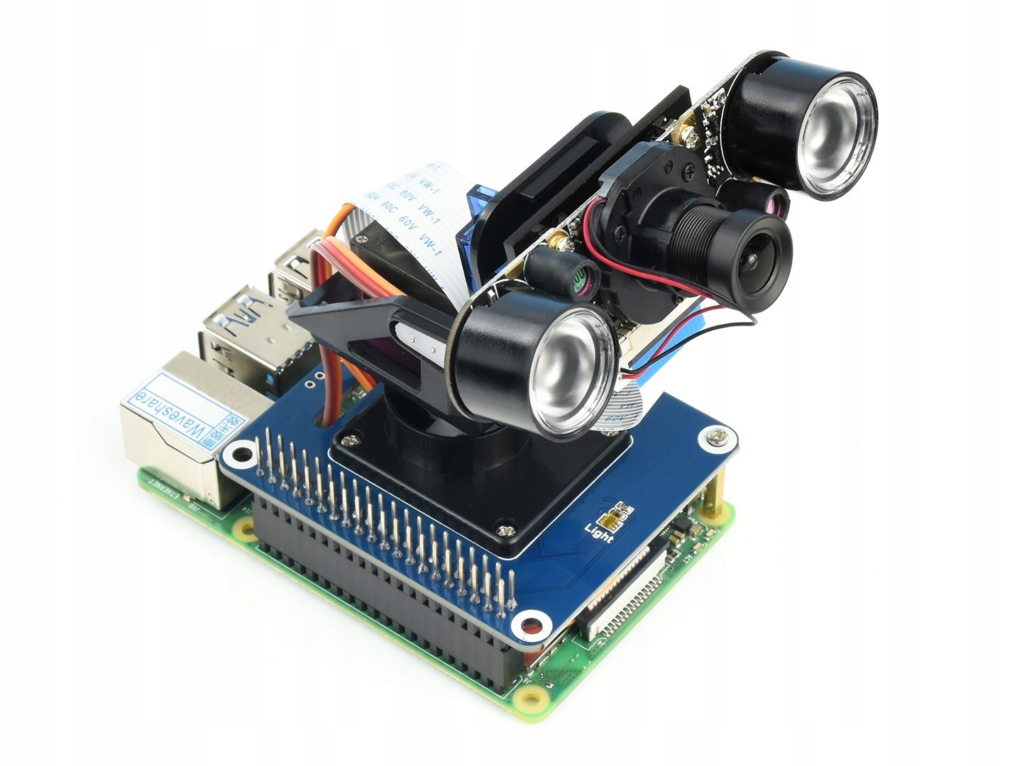 Платформа керування, оснащена сервоприводами, дозволяє керувати положенням камери за два розмірів за допомогою міні-комп’ютера Raspberry Pi. Має вбудований ШІМ-контролер на базі чіпа PCA9685, який спілкується через інтерфейс I2C, і датчик освітленості TSL25911FN з АЦП з роздільною здатністю 16 біт. На платі є перетворювач рівня напруги, завдяки якому модуль сумісний з напругою 3,3 В і 5 В. Набір буде використовуватися в проектах, де потрібна рухома камера. Повна документація доступна на сторінці продукту.