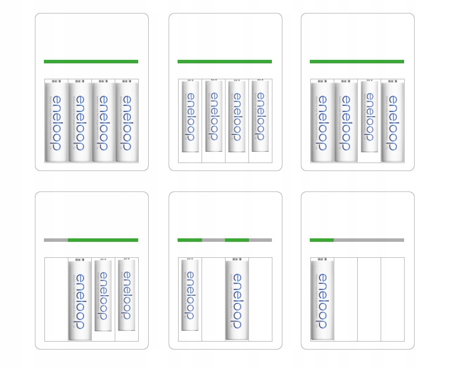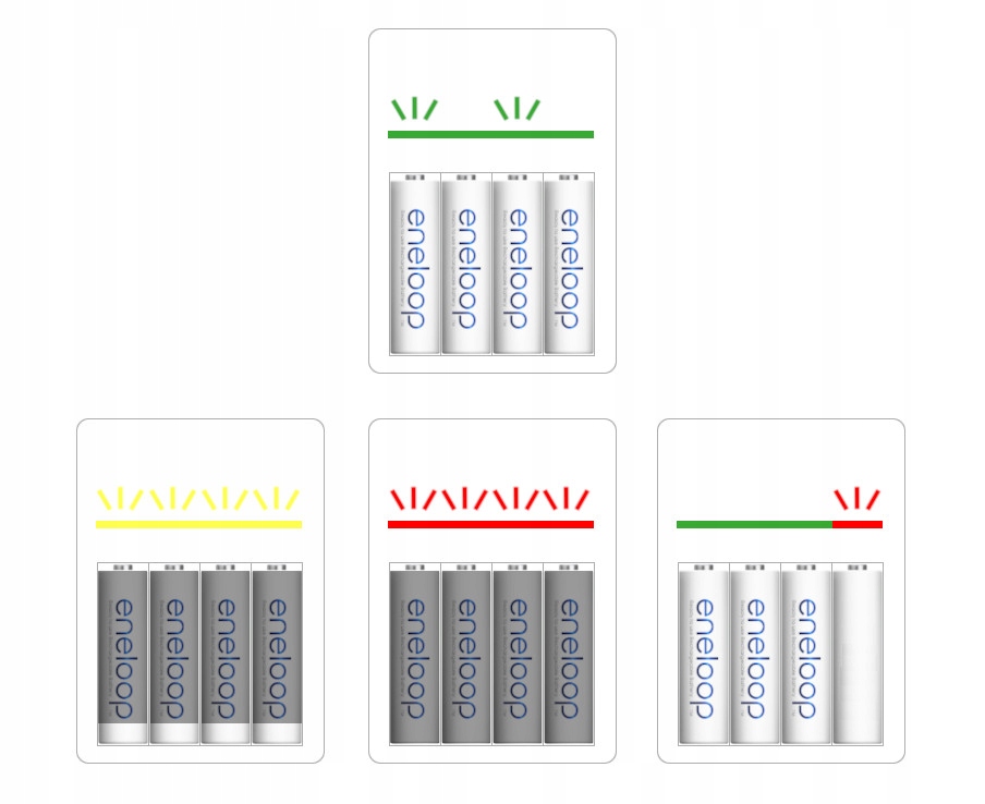 Перед початком заряджання зарядний пристрій перевіряє кожну вставлену батарею (3 секунди чергує блимання зелених світлодіодів), а потім повідомляє про стан вставлених елементів.