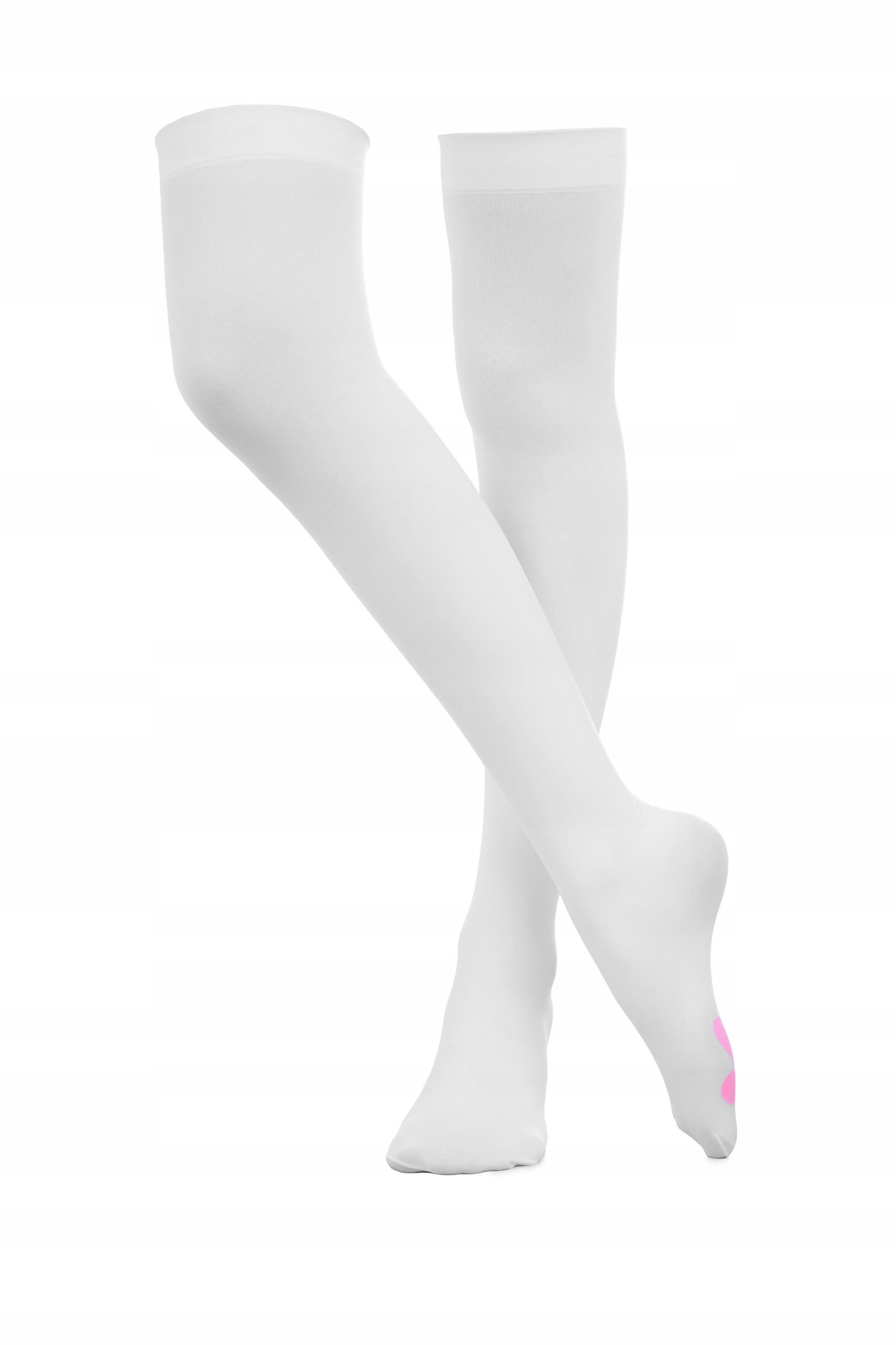 Білі панчохи з принтом виготовлені з м’якого, еластичного та приємного на дотик матеріалу. Завдяки широкій гумці панчохи не сповзають і добре сидять на нозі, забезпечуючи комфорт при носінні. Непрозорі панчохи ідеально сидять на ногах, їх можна закріпити на поясі або носити без пояса. Білизна дуже елегантно виглядає на тілі і комфортна в носінні.