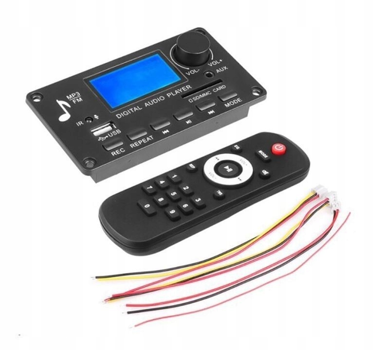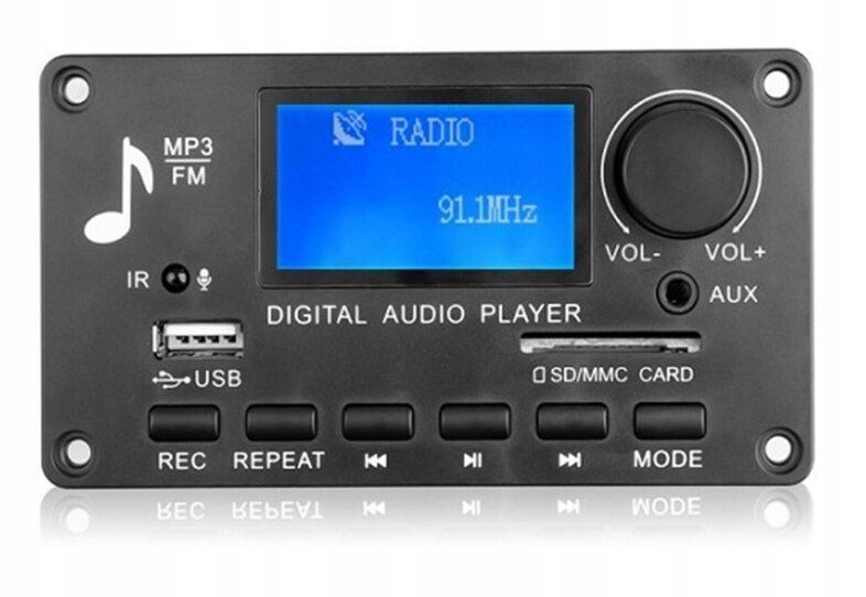 MP3 панель з будівельним РК -дисплеєм на аудіо -пристрої. Це дозволяє відтворювати файли у форматі MP3, WAV та WMA з USB -пам'яті, карт MicroSD, іншого пристрою через AUX та через Bluetooth 5.0. Він має побудований приймач FM, який дозволяє отримувати радіостанції в стандартній діапазоні частот від 87,5 МГц до 108,0 МГц. Модуль керується за допомогою чотирьох кнопок, вбудованих на панель, або пілота, прикріпленого до набору. Набір ідеально підходить для створення власного аудіо пристрою, оснащуючи їх усіма необхідними методами відтворення музики.