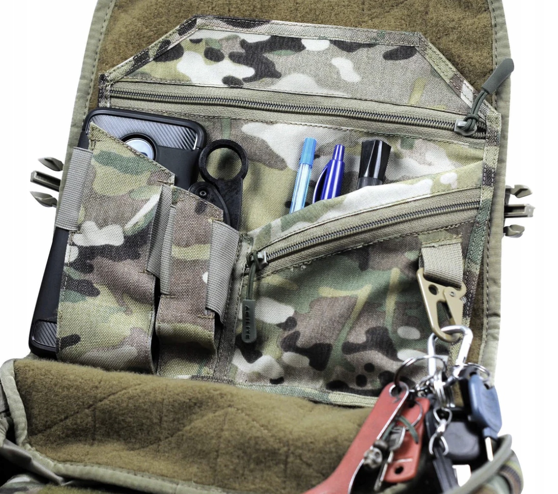 Він має дві кишені на блискавці для зберігання цінних або менших предметів, а також відділення для ручок, багатофункціональних інструментів, ліхтариків, засобів виживання, документів та електроніки, а також металевий карабін для кріплення ключів та інших предметів.