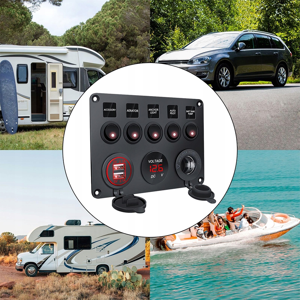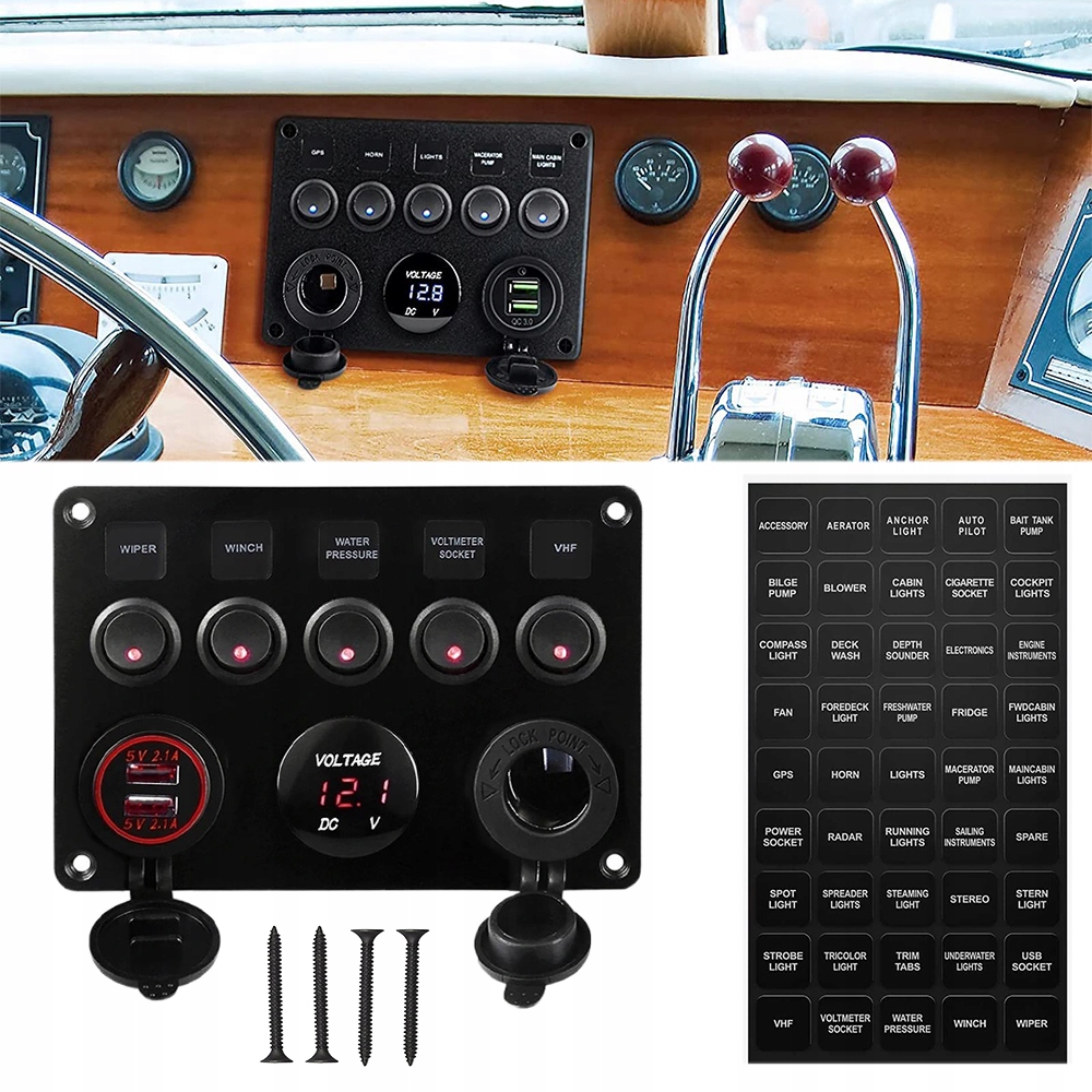 5. Включає 5 перемикачів, подвійний автомобільний зарядний пристрій USB, цифровий вольтметр і розетку.