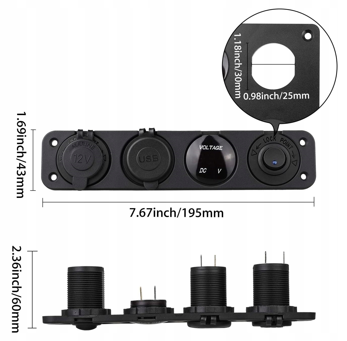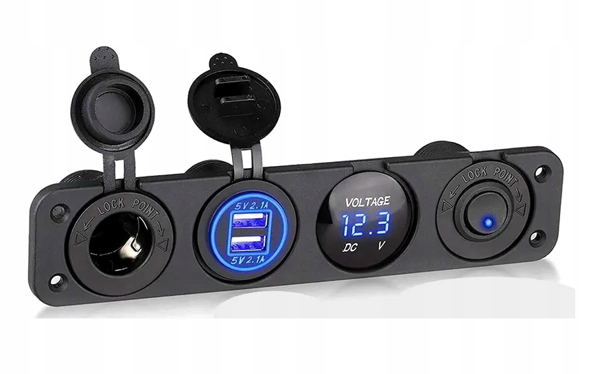 Панель складається з гнізда прикурювача, перемикача, цифрового вольтметра, що відображає поточний рівень напруги акумулятора, і двох портів USB для швидкої зарядки напругою 5 В 4,2 А (2,1 А + 2,1 А).