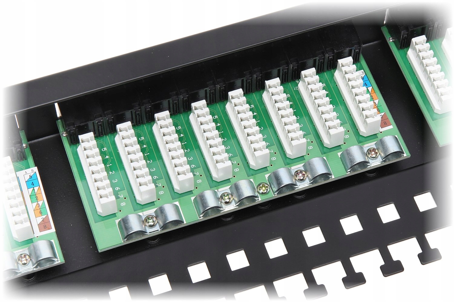 - Вибрані характеристики: Відповідає вимогам категорії 6, Пружинні затискачі для кабелю витої пари дозволяють швидко встановлювати без використання інструментів, Є отвори на платі, які дозволяють приєднувати кабелі до кабелю краватки