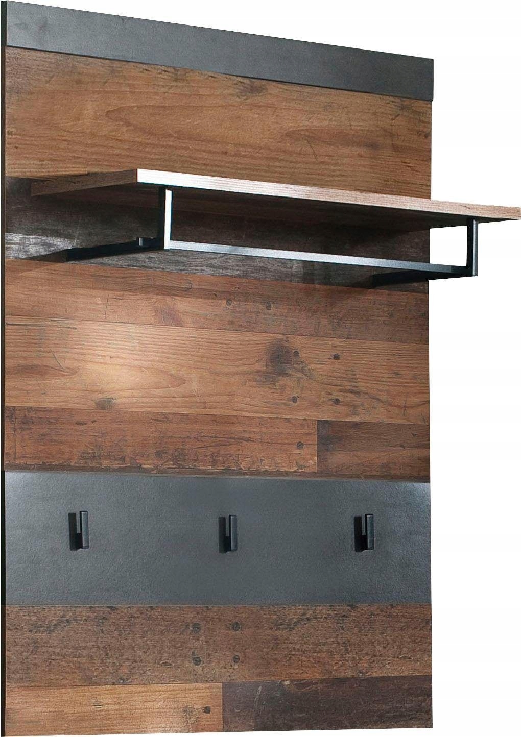 Стильна гардеробна панель з колекції меблів Hindon. Він характеризується старовинним дизайном, виконаний у сільському стилі. Має практичну верхню полицю, штангу для вішалок і три гачки для верхнього одягу знизу. Виготовлена з фольгованої плити, стилізованої під зістарене дерево з графітовими вставками.