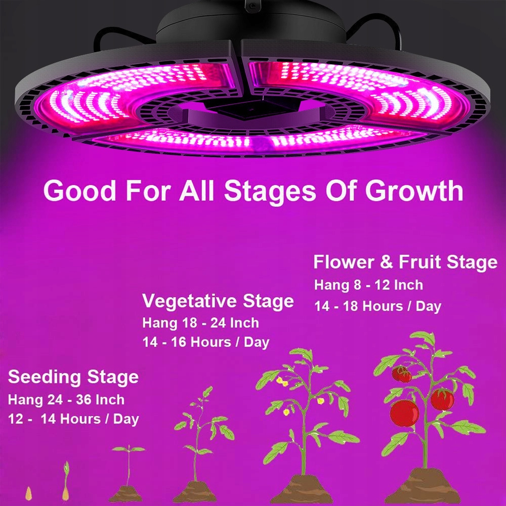 【Складна лампа для росту】 Лампа для росту має 3 стулки, кут яких можна регулювати на 90°. З кутом променя 120° 3 крила створюють світло, розширюючи ефективну площу освітлення для більшої кількості рослин. Світлодіодне освітлення може покривати 16,5 x 16,5 м/5 x 5 футів у макс. За мінімальних витрат ці світлодіодні світильники для вирощування забезпечують цільову довжину хвилі для великих площ, щоб стимулювати ріст кімнатних рослин.