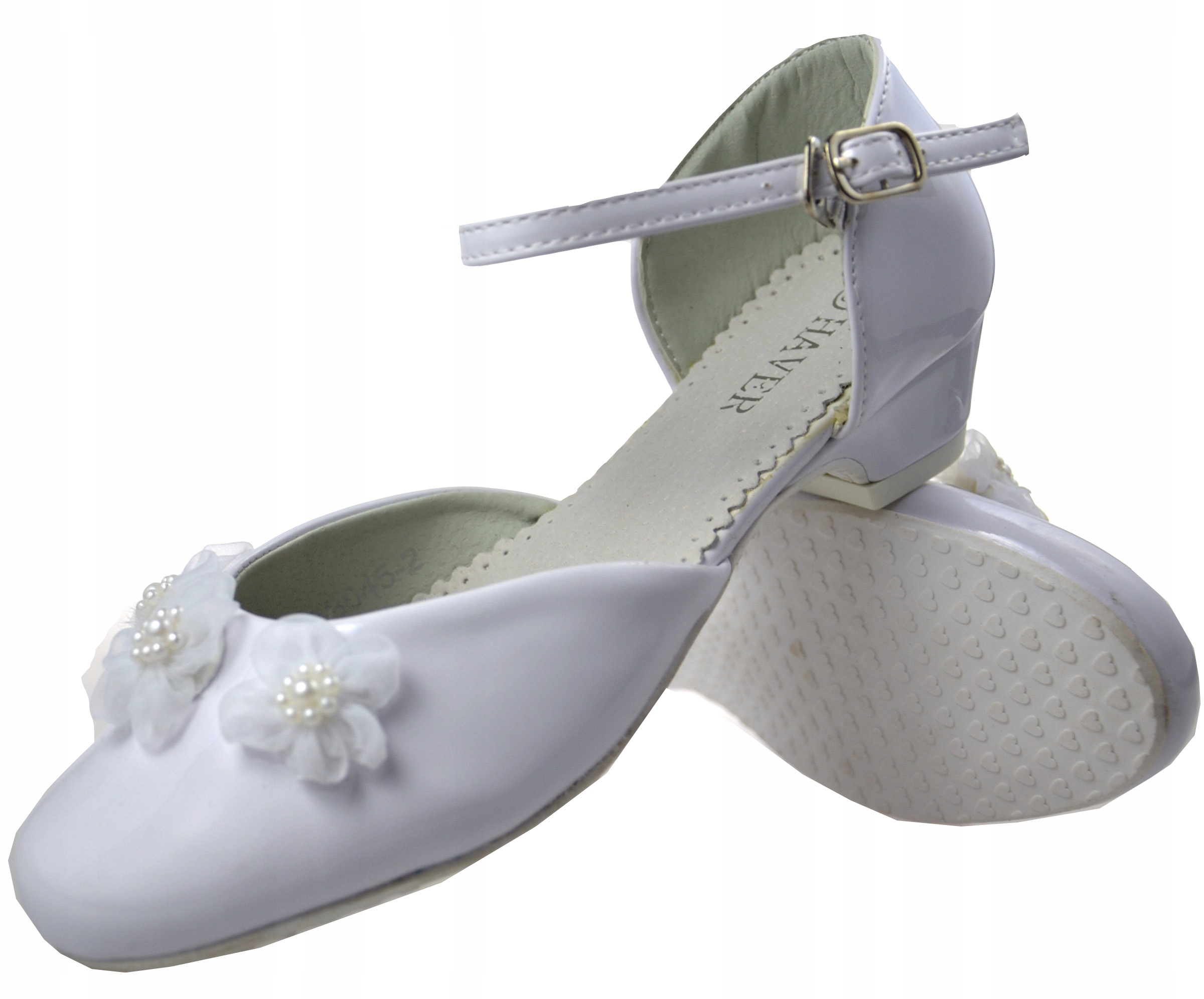 Дуже зручні стійкі туфлі на низькому каблуці зі сріблястою фурнітурою. Туфлі з тюлевими квітами та білими перлами. Виготовлений з екологічної шкіри зі вставкою з натуральної шкіри. Розумно одягається без постійної застібки на пряжку. У цьому взутті перед пряжкою вставляється металевий гачок. Взуття від відомого виробника.