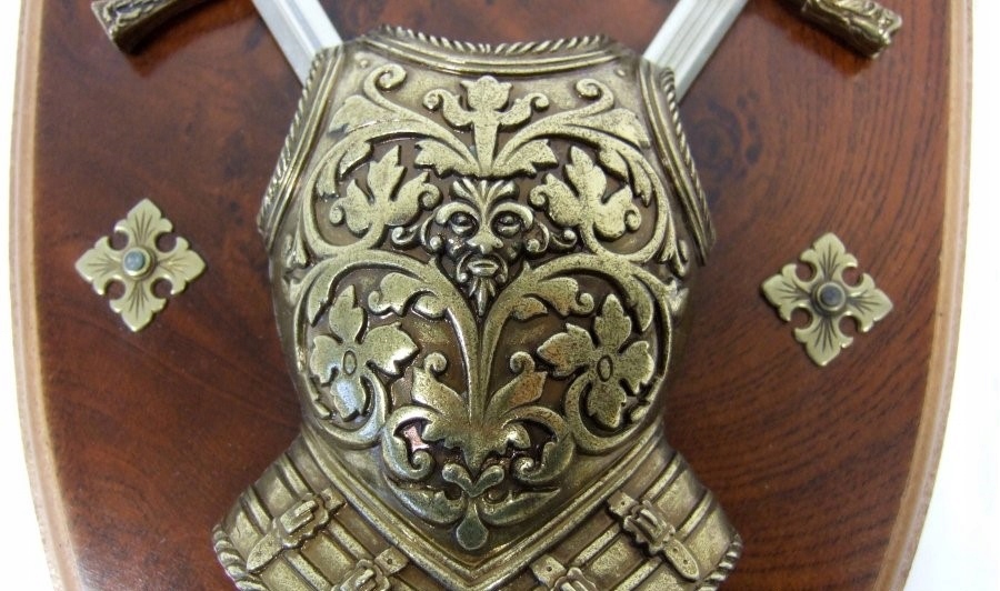 Паноплія, виготовлена з фанери, що імітує деревину у формі середньовічного покриття, з металевою реплікою декоративного нагрудного знака, прикріпленого до нього. Ціле доповнюється, перетинаючи, проходячи через центр нагрудного знака, два мініатюри мечів - стилізовані в Екскалібурі та мечі Чарл Великого. Паноплія додатково прикрашена чотирма символами. Кароль Великий був королем франків і Лонгбард, а з 25 грудня, 800 Римського імператора. Він був найвидатнішим правителем середньовічної Європи. Під час правління Карл Великого поділу світу на римські та Барбаричні були замінені поділом на християнський (цивілізований) та язичницький (варварський) світ. Екскалібур або у вільному перекладі "Меча світла" - це легендарний меч, який отримав король Артур після відриву меча з каменю з озера. Меч повинен був бути вічним, і його піхва мала майно, що той, хто його носив, не загрожував жодних ран. Обидва мечі можна витягнути, якби тільки краще подивитися на них!