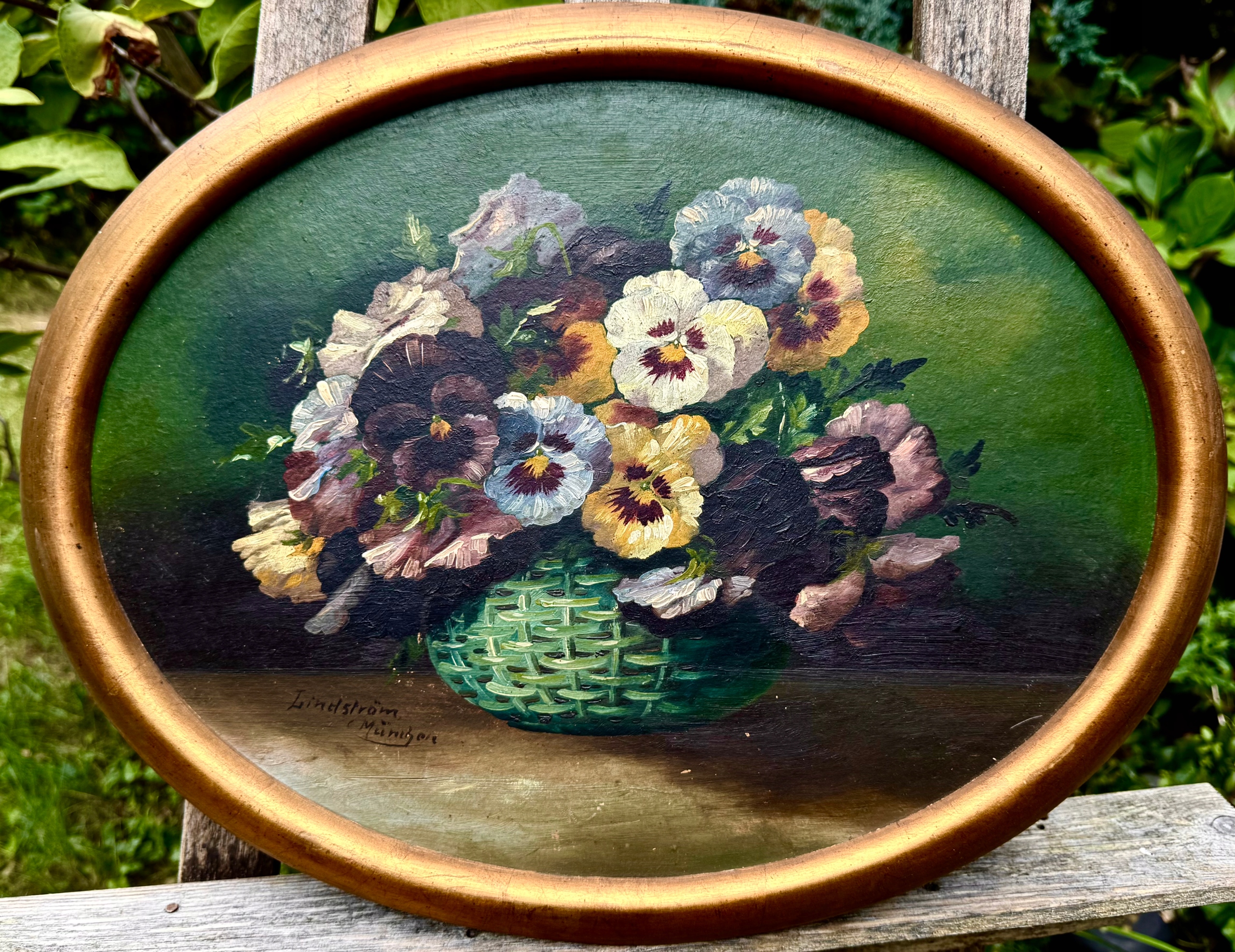 Панси в плетеному кошику натюрморту в овальній рамці, стара цінна картина