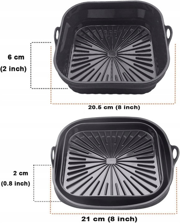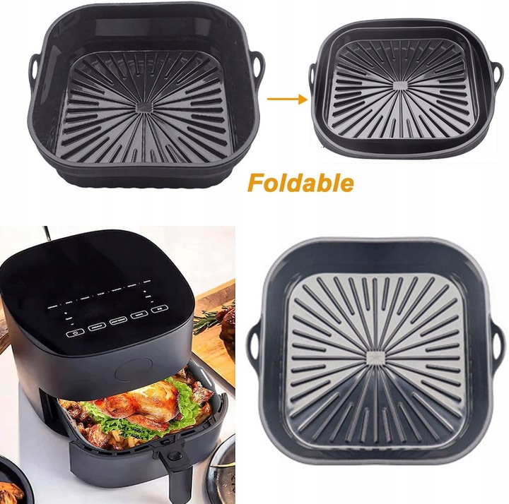 Згинання. Його можна вставити безпосередньо під час приготування їжі. Піднесений край 4,5 см захищає сторони фритюрниці до гарячого повітря і запобігає йому їжею. Дизайн -миска не тільки полегшує зберігання страв, але й запобігає жиру в нижній частині горщика.