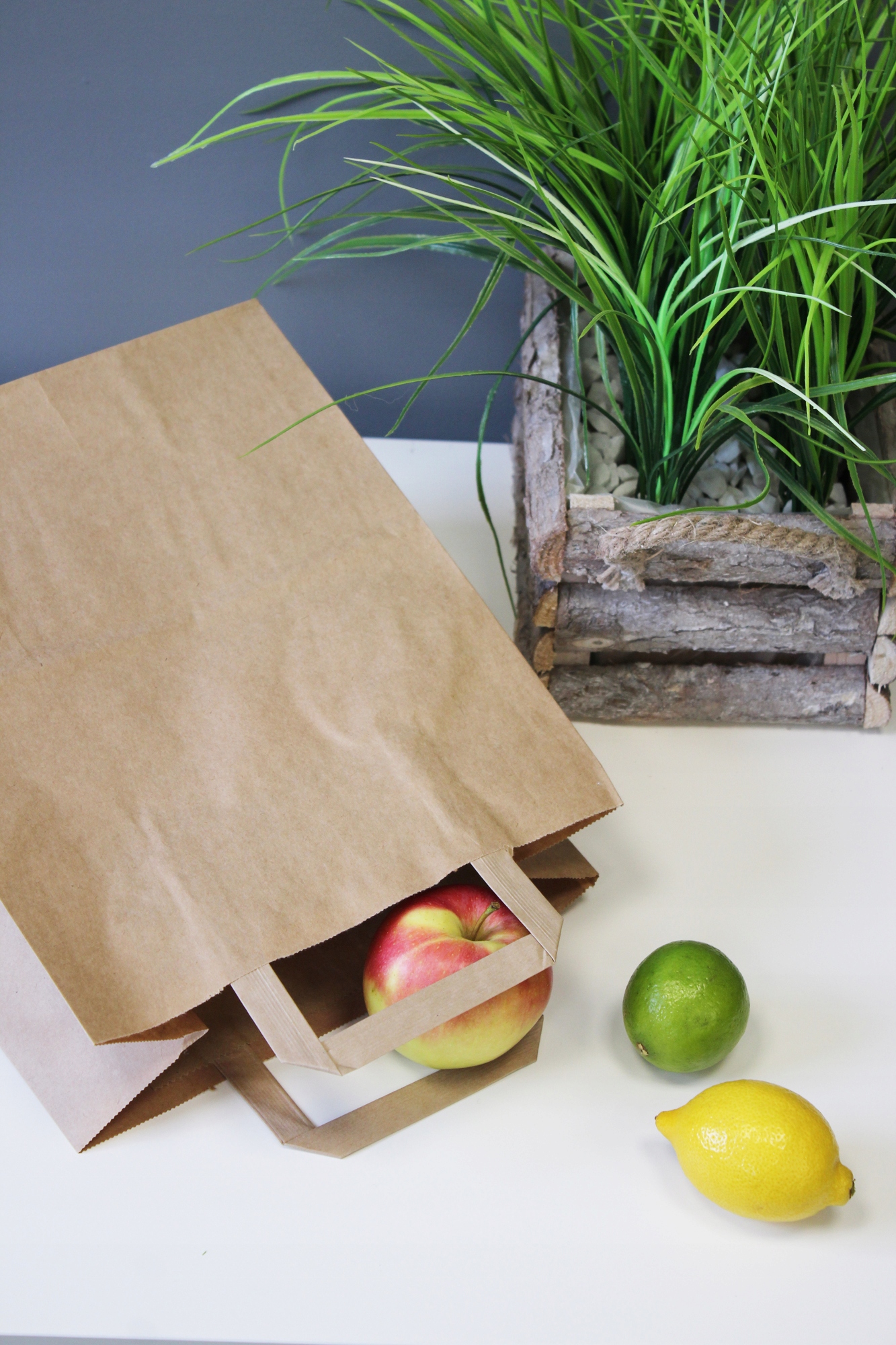 Паперові пакети з плоскими ручками доступні в коричневому (сірому) та білому кольорах