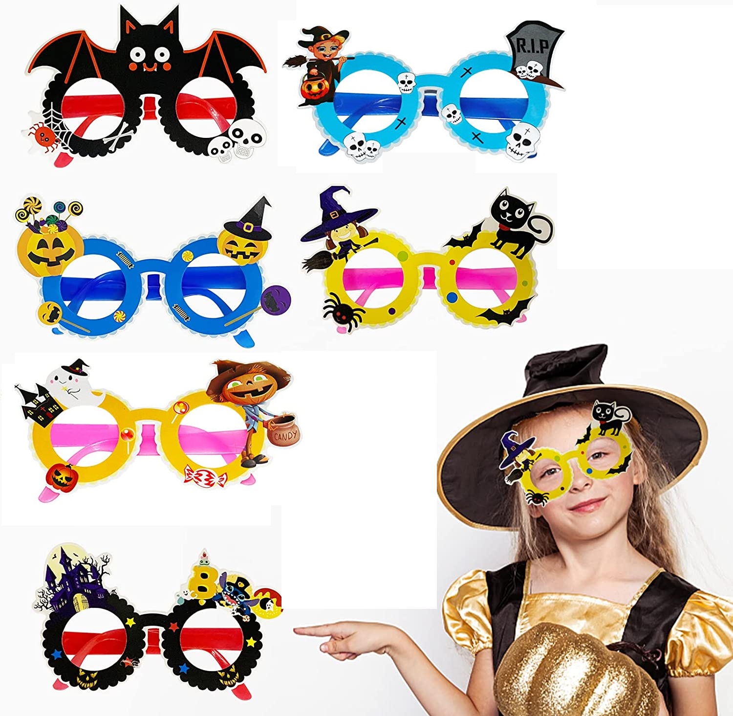 Обсяг доставки: Набір включає 6 окулярів на Хеллоуїн, повні веселі елементи Хеллоуїна, щоб дати своїй родині незабутні моменти. Окуляри на Хеллоуїн підходять для костюмів на Хеллоуїн, аксесуарів для вечірок, цін, реквізитів для стендів, маскарадів, косплей, фестивалів та карнавалів. Партія.