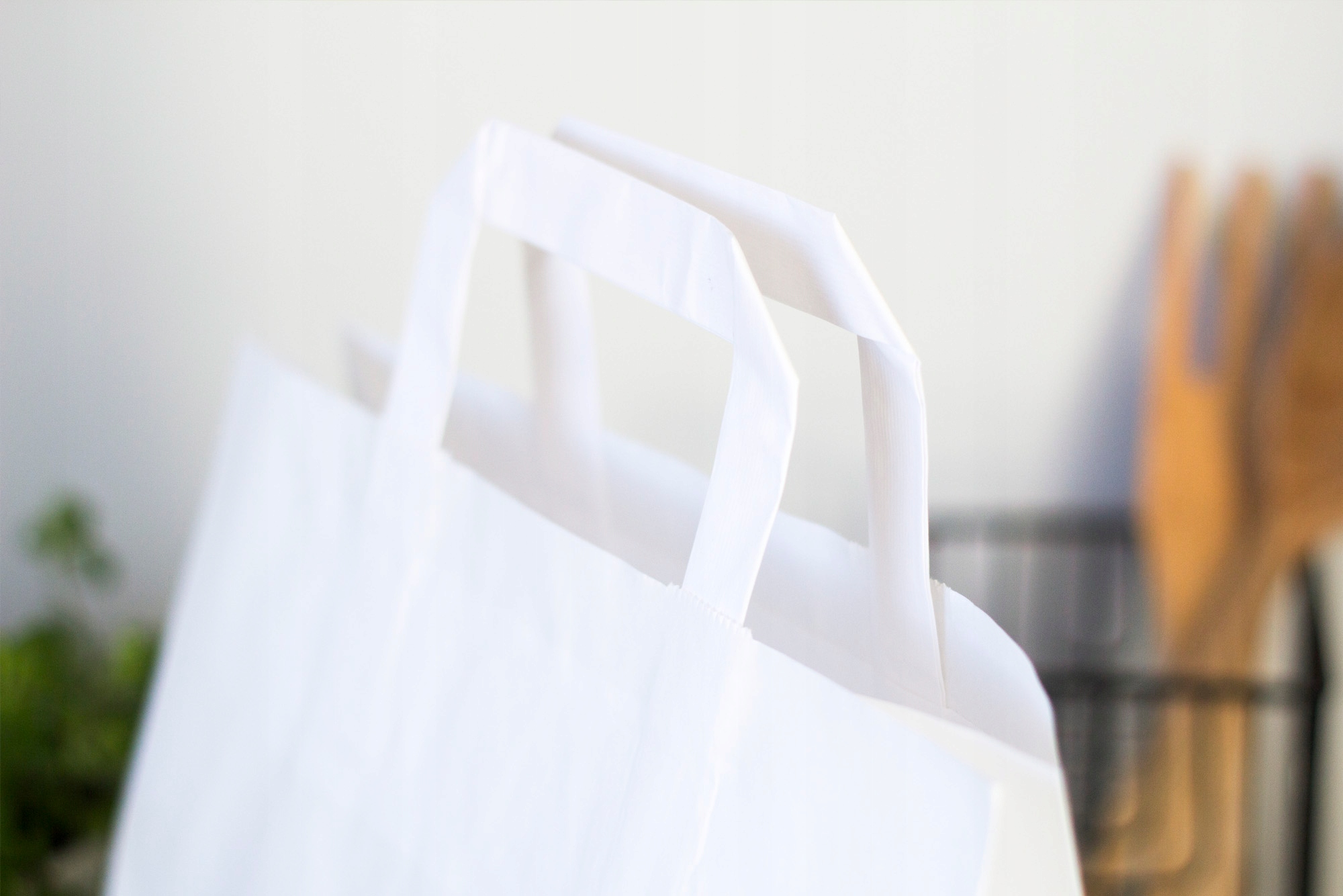 Паперові пакети з плоскими ручками доступні на інших наших аукціонах Allegro у двох стандартних кольорах: білому та коричневому. Коричневий, 70 г/м2, білий - 80 г/м2.