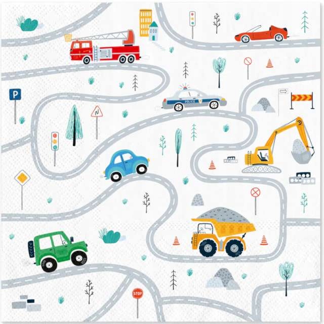 Набір крутих паперових серветок з мотивом міського транспорту та будівництва. Вони чудово підійдуть як прикраса столу на дні народження вашої дитини. На білих серветках зображені дорога та транспортні засоби, такі як екскаватор, джип, жук, самоскид, поліцейська машина, пожежна машина та кабріолет. Якщо ваш син є шанувальником автомобілів, вид такої прикраси неодмінно викличе посмішку на його обличчі.