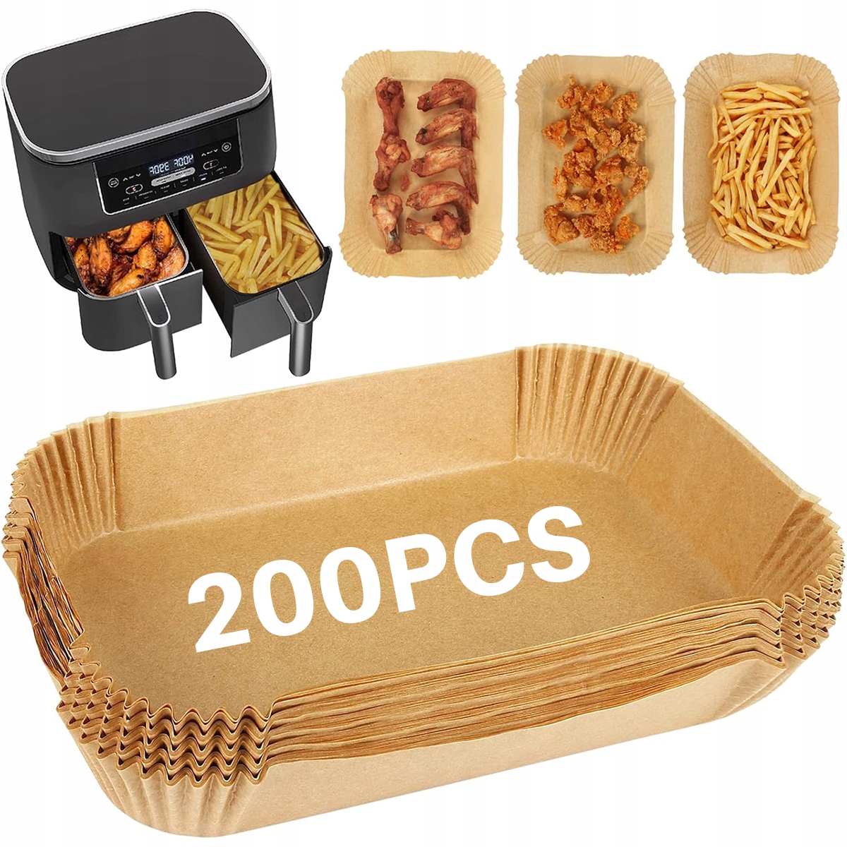 Ці паперові вкладиші для аерофритюрниці ідеально підходять для випічки, смаження, смаження, пароварки, сковороди, мікрохвильової печі, аерофритюрниці. Підходить для Ninja AF300EU, AF400EU, AF451EU, SL400EU, COOKWISE 9L, COSORI 8.5L та інших двозонних фритюрниць об'ємом 7.6-9.5L. Виберіть наш безпечний і здоровий папір для випікання для аерофритюрниці та більше не турбуйтеся про правильний розмір паперу для випікання для вашої аерофритюрниці Ninja.
