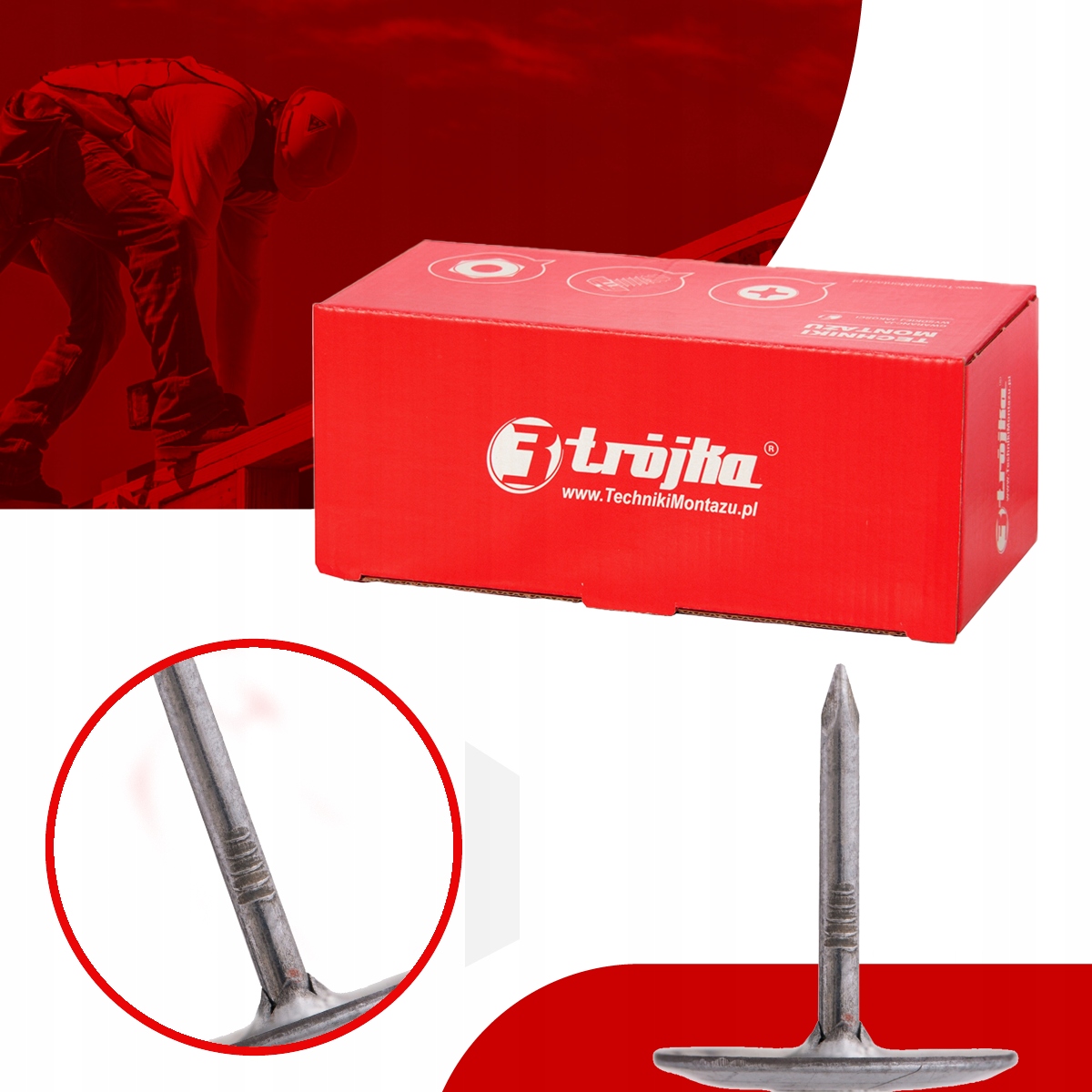 ?? Цільти для тротуару з оцинкованою накладкою Trójka виготовлені з з жорстким металевим підтягнутим оправою з одного боку, з іншого, закінченими плоскою збільшеною головою з накладкою. Мацина сильно упакована, вона не вільна, не залишає нігтя. Цвях використовується для кріплення бітумінозного покрівельного черепиця, пластикових фасадів для дерев’яних конструкцій, сланцевих плиток. З'єднання підтримується завдяки силам тертя, що діють уздовж осі нігтів і завдяки жорсткості стебла. Цвяхи та прокладки виготовлені з високоякісного сталевого дроту , і завдяки процесу гальванізації вони стійкі до погодних умов .