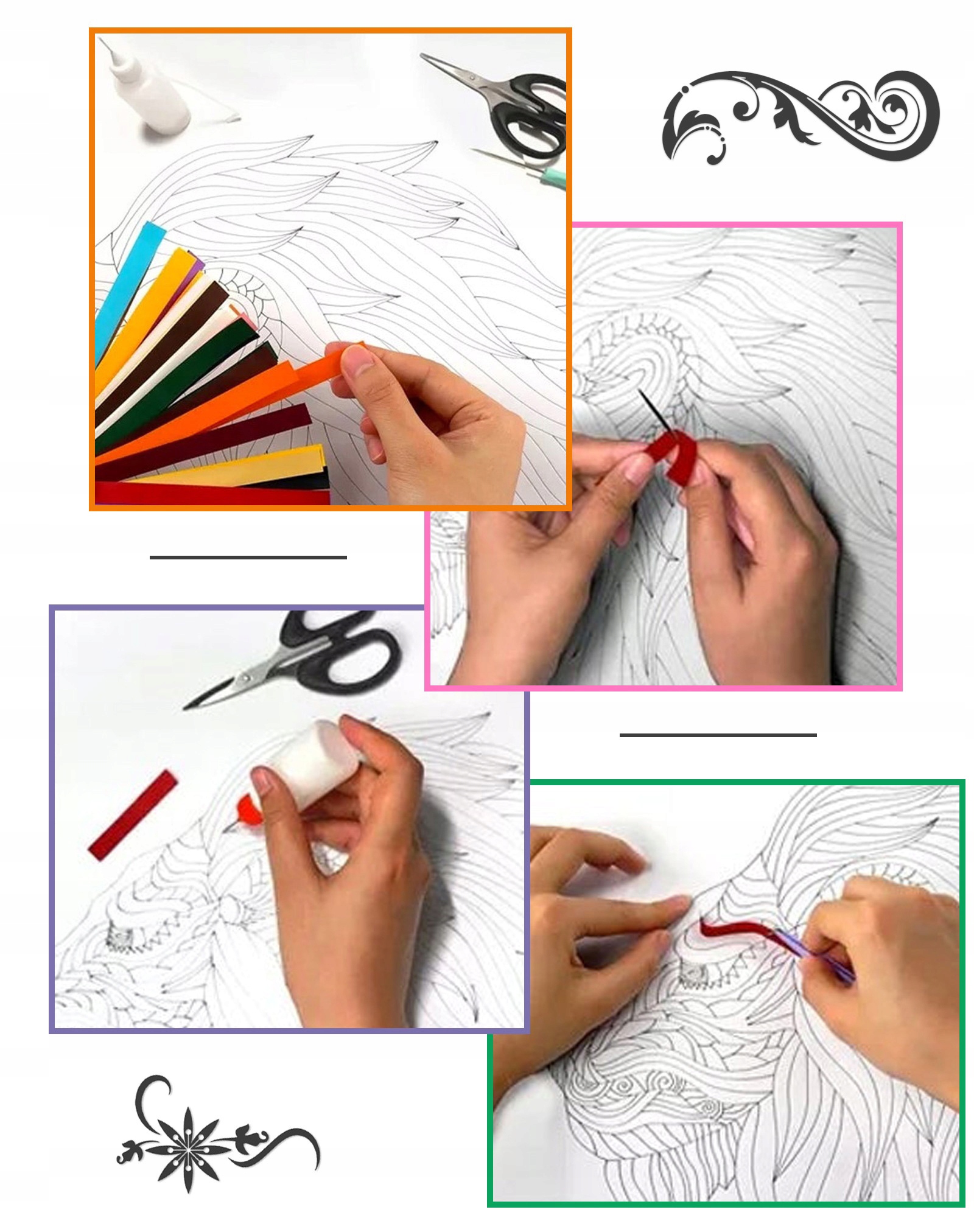 - Набір: кольоровий паперові смужки, пластина з шаблоном, аплікатор клею*, пінцет, гачок для в’язання, ножиці та інструкції.