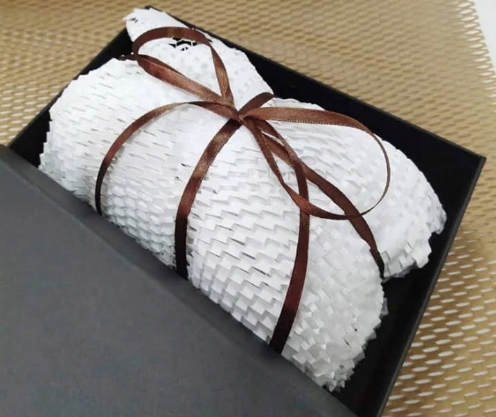 Після розтягування створюється тривимірна паперова сітка зі стільниковою структурою, яка використовується для кріплення продуктів, забезпечуючи їх захист під час транспортування. Сусідні шари поєднуються, створюючи ефект, схожий на стрейч-фольгу. Завдяки паперовій сітці без пилу та пилу ви можете легко загортати, блокувати, зміцнювати, заповнювати та переплітати. Це елегантний і екологічний захист для відправлення ваших речей, рекомендований особливо людям і компаніям, які піклуються про природне середовище.