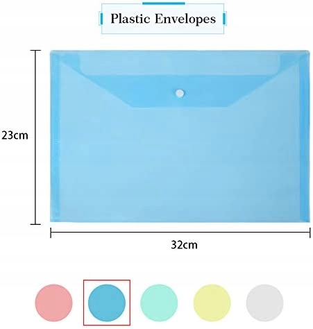 в упаковці 10 штук, 5 кольорів, кишеньки на ґудзиках А4, розмір 33*23 см (довжина х ширина). Розмір пластикових папок трохи більше А4, вміщає більше файлів.