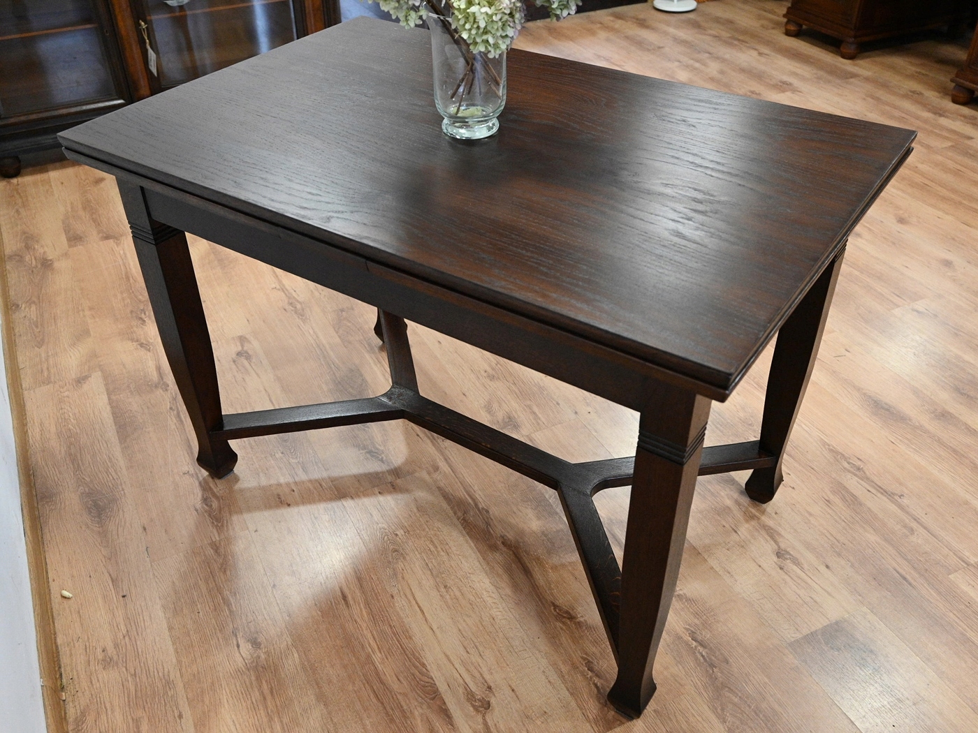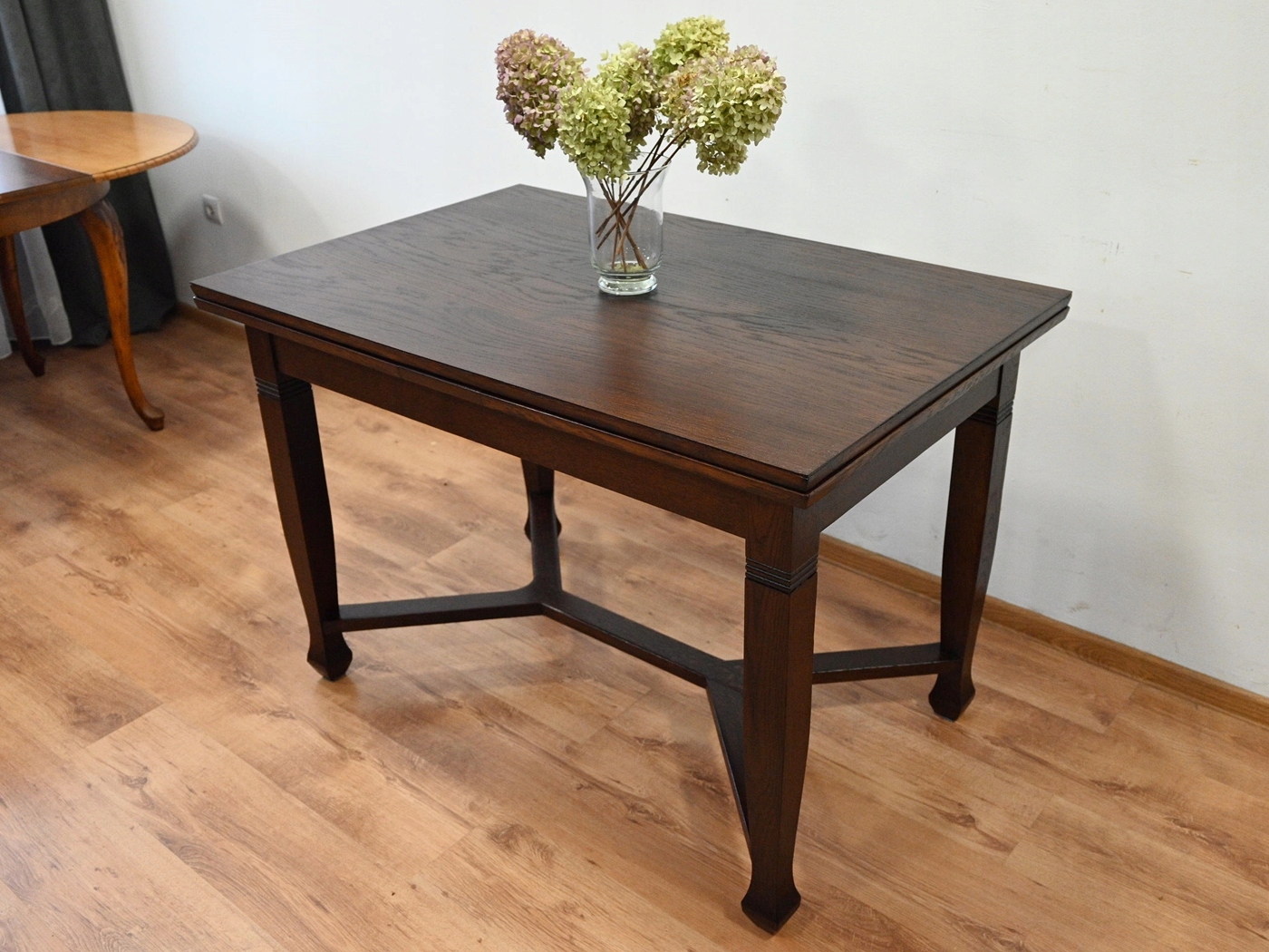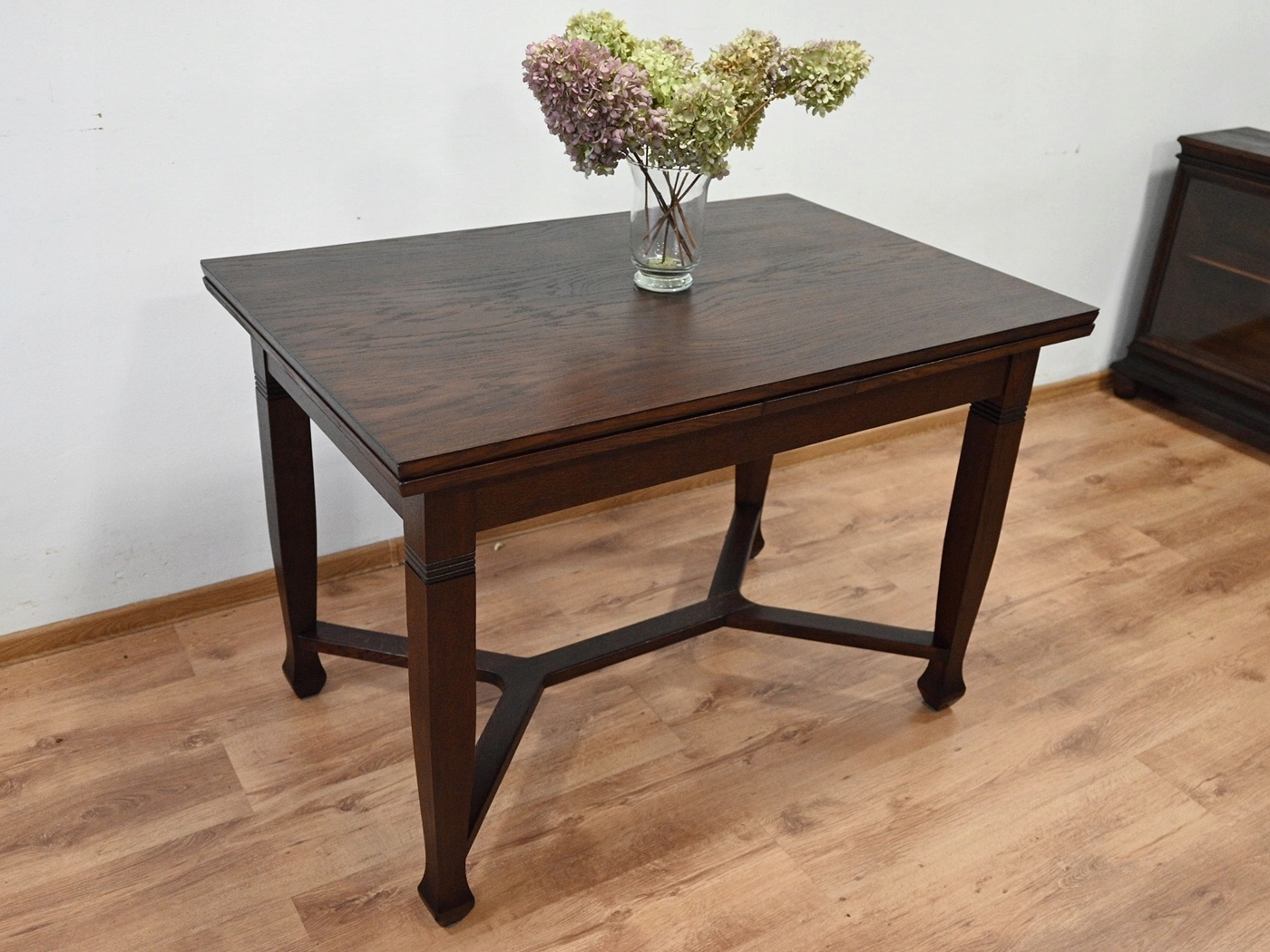 Дуже хороший стан. Меблі, підготовлені до використання. Зовнішні поверхні та центр меблів були оновлені. Меблі вже мають свої роки та сліди минулого часу, що не впливає на його естетичний прийом, вони є свідченням справжності меблів. Стіл можна відразу поставити в квартиру.