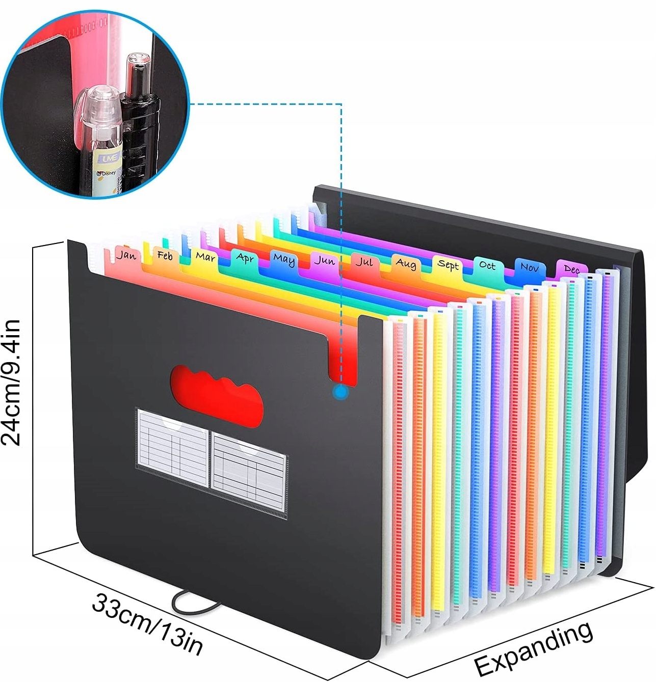 Має 24 різнокольорових кишеньки для документів формату А4, легко помістити до 3000 аркушів паперу в кишеньковому папірці