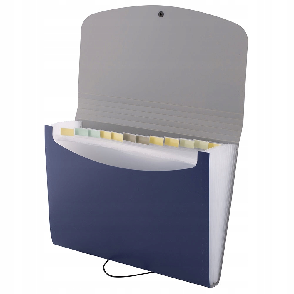 Зручна папка для зберігання документів у форматі А4. Оснащений 12 відділеннями для ефективного розділення документів, напр. дати. Незамінний під час роботи в полі, під час конференцій чи відряджень. Надійний помічник у систематизації нотаток, ідеальний для кожного старшокласника та студента. Еластична застібка запобігає випаданню документів під час транспортування. Внутрішні відділення оснащені кольоровими змінними етикетками для опису вмісту. Папка виготовлена з міцної PP фольги.