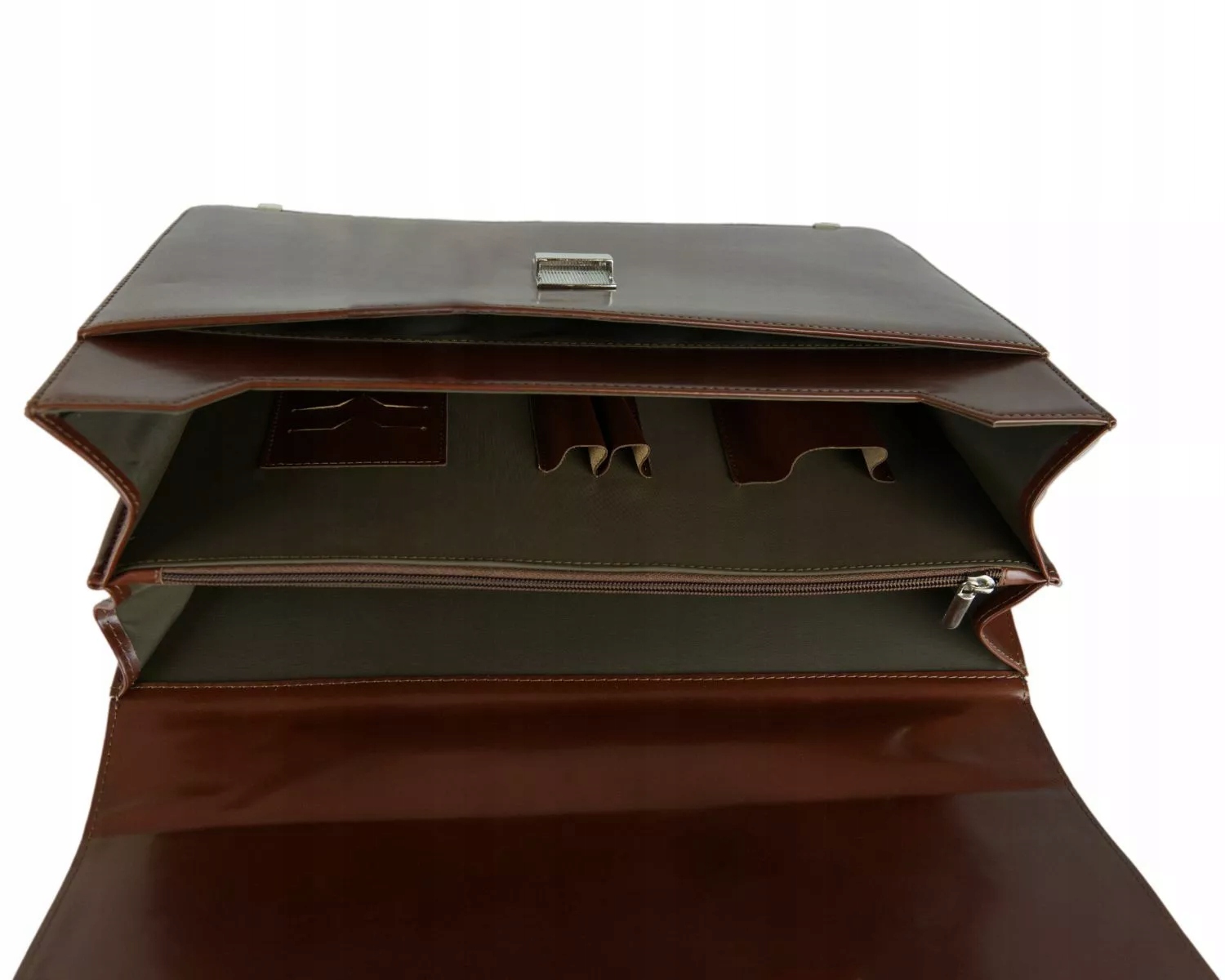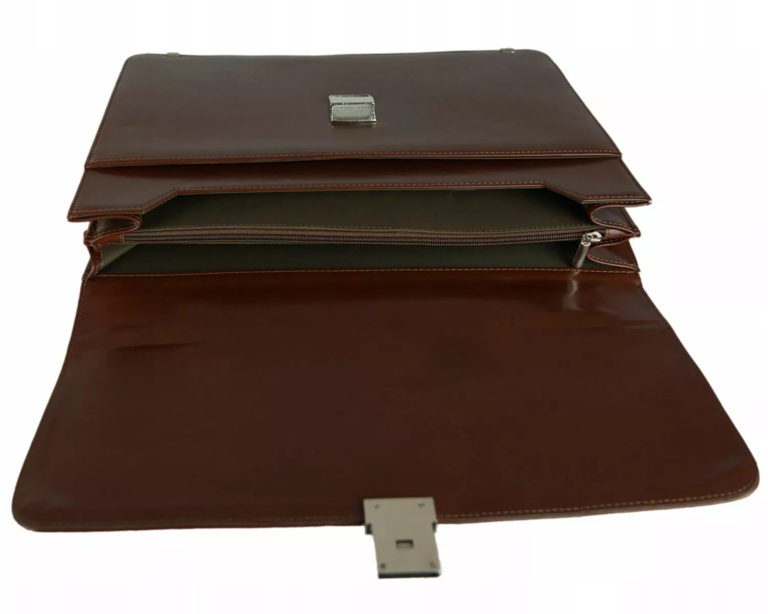Портфель закривається на клапан і засув. У верхній частині має зручну шкіряну ручку для носіння в руці. Портфель також має регульований шкіряний ремінь, щоб ви могли носити його на плечі.