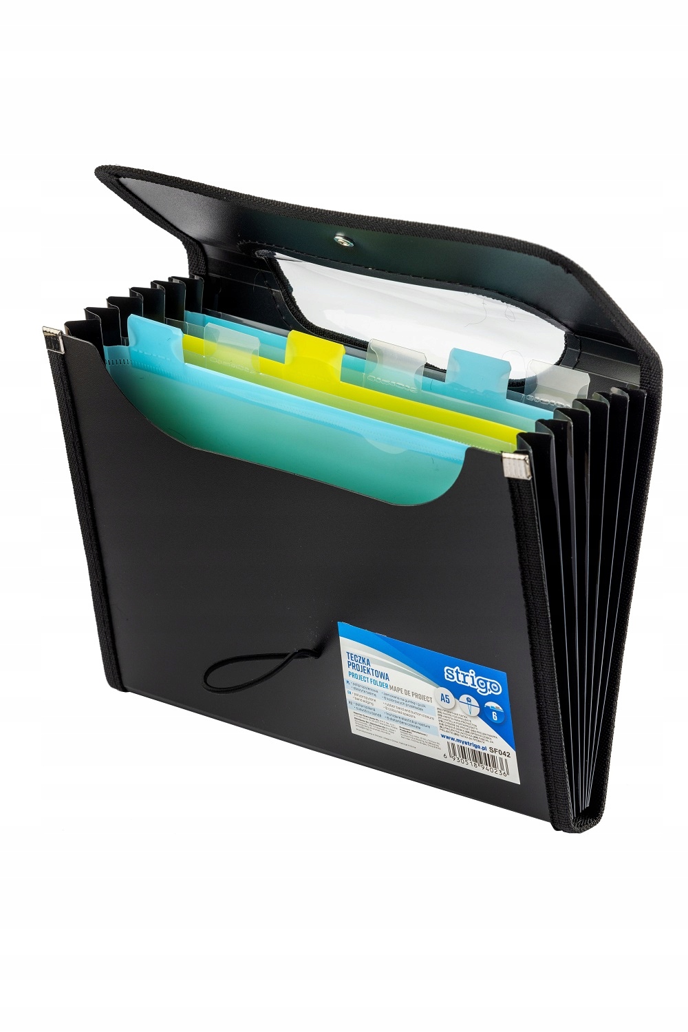 VFILE STRIGO чорного кольору у форматі A5 має 6 кольорових розділювачів з індексом і місцем для вставки, наприклад, аркуша паперу з інформацією. p>