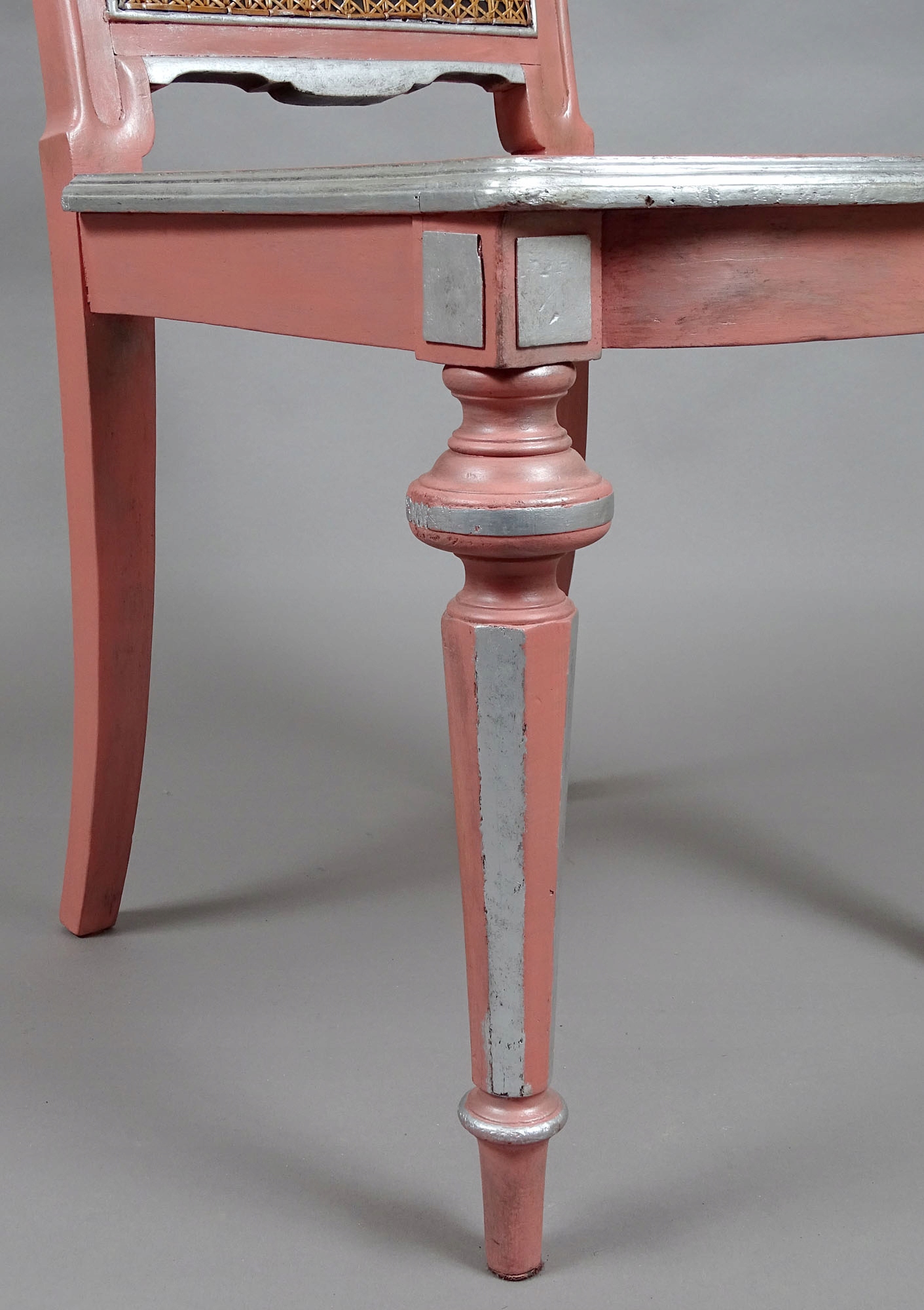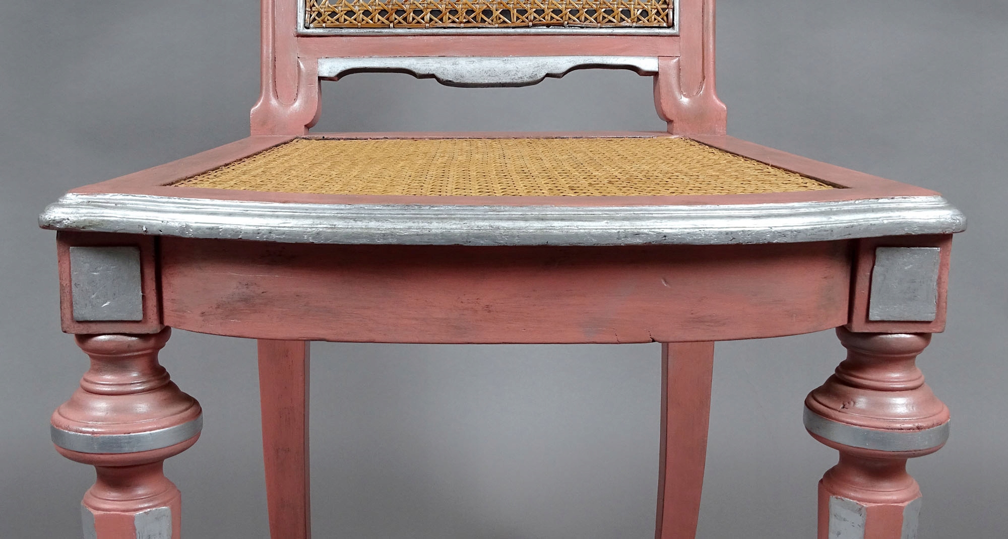 із ротанговим сидінням і спинкою, що спирається на чотири ніжки, передні ніжки повернуті, звужені донизу з ніжкою на нижні, задні кутасті, злегка загнуті. Сидіння спереду трохи ширше, спинка нахилена назад. Рарія на сидіння і спинку встановлена напевно кілька років тому в хорошій майстерні, її стан не викликає побоювань. Рожева конструкція зі срібними вставками.