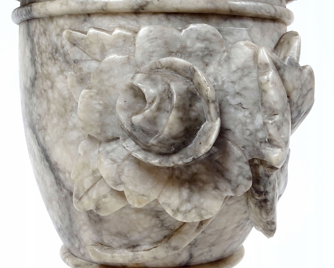 з круглою підставкою, з циліндричним древком, що звужується до верху, з кількома тисненнями по периметру. Зверху різьблені квіткові чашечки з листочками, над ними чотири ажурні листочки, звернені вгору. Вгорі кругле місце для свічок, листочки меншого розміру по всьому колу.