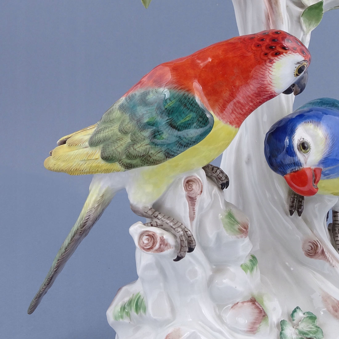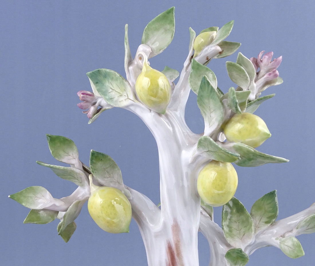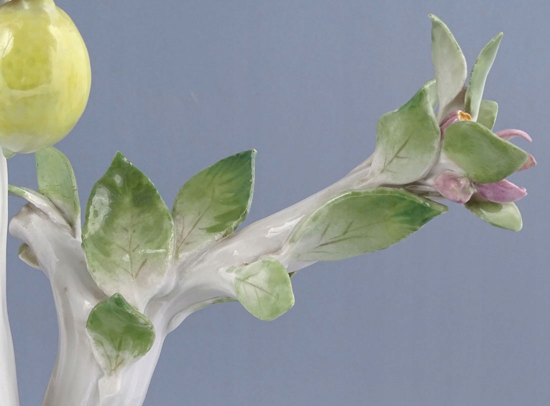 з основою, подібною до овалу. Птахи з жовто-зеленим, червоно-жовто-зеленим блакитним кольором. База, прикрашена листям зеленого та коричневого кольору. Дерево з кількома гілками білими, з гілками із зеленим листям і кількома жовтими лимонними фруктами. Основа, підписана з кобальтом двома схрещеними мечами.