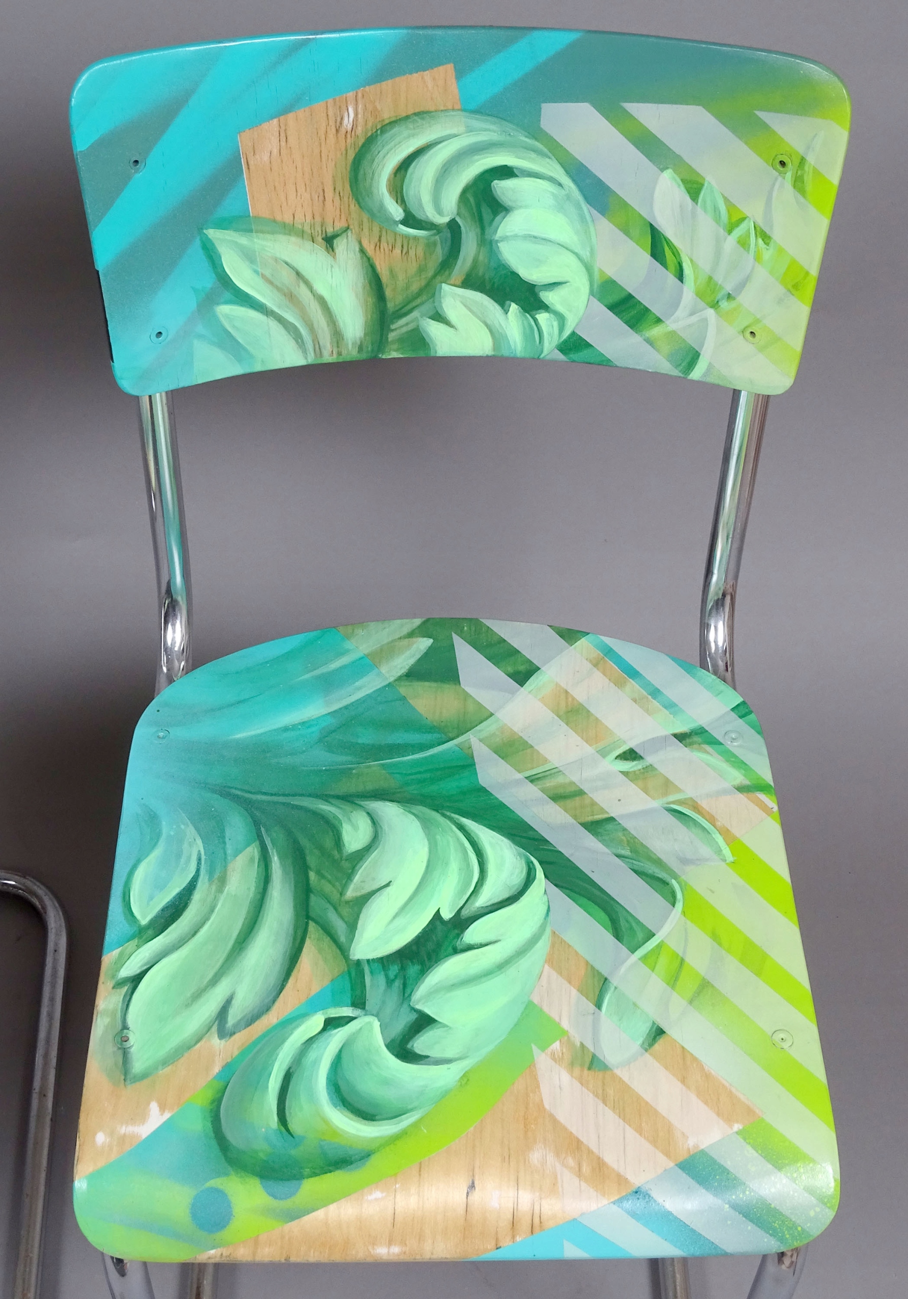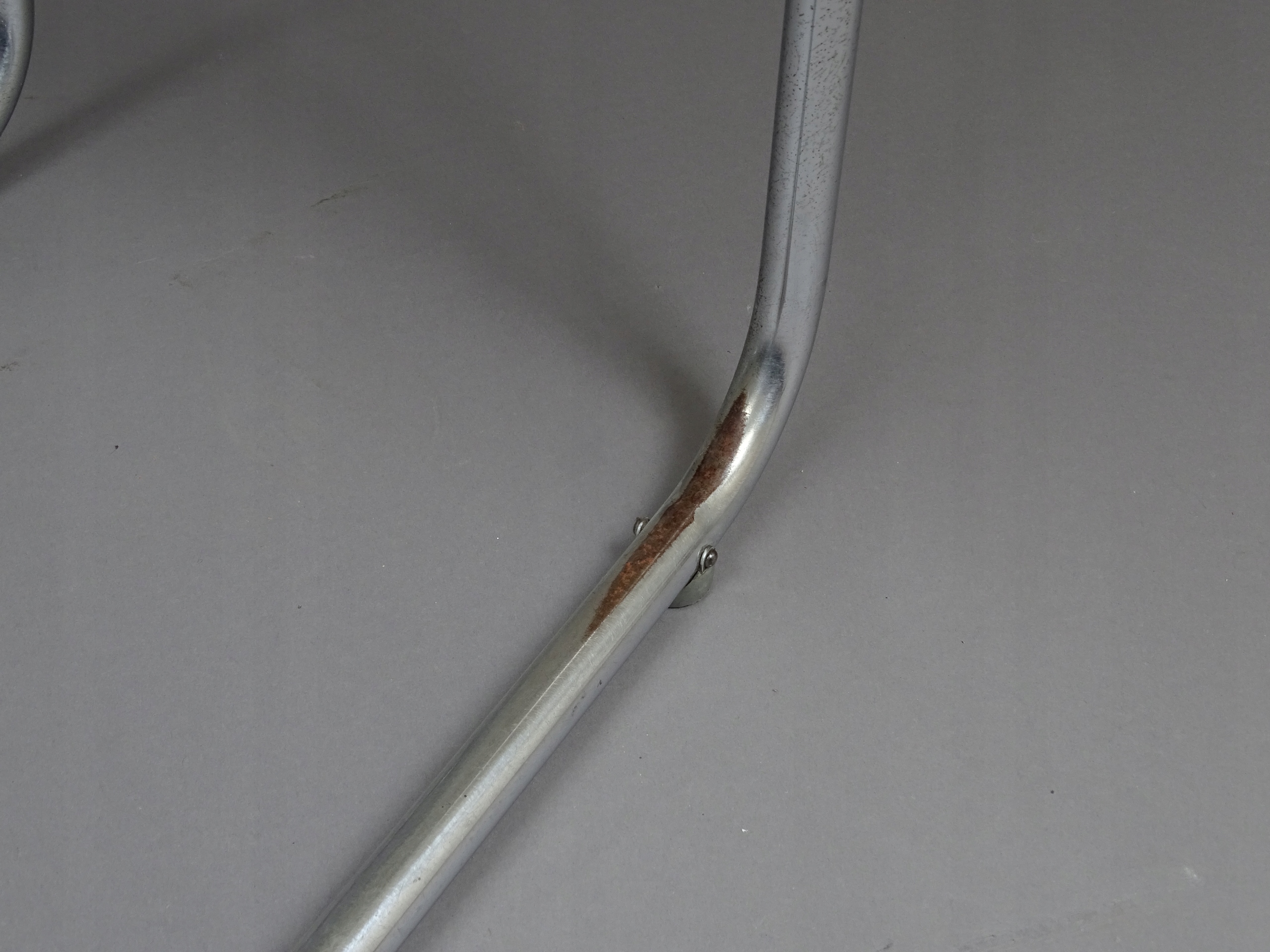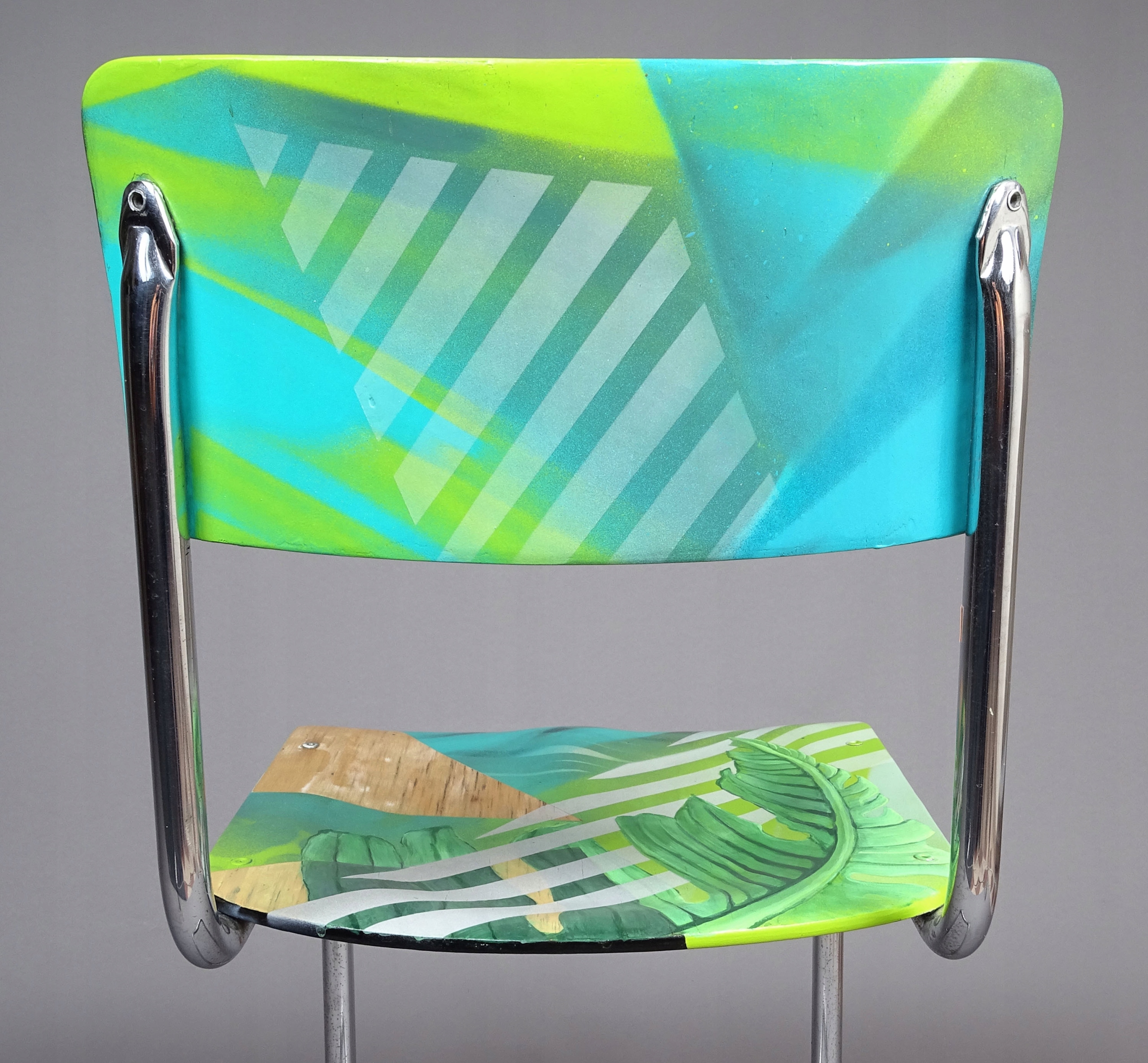 Пара стільців з профільованими сидіннями та спинками з фарбованої фанери. Конструкція виконана з хромованої сталевої труби у вигляді полозів, яка також підтримує сидіння і спинку. Візерунок описаних стільців є джерелом натхнення для сучасних репродукцій у стилі Баугауз або бохо.