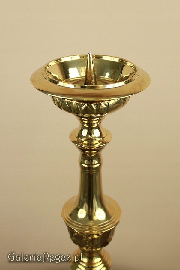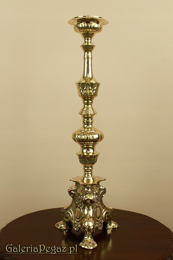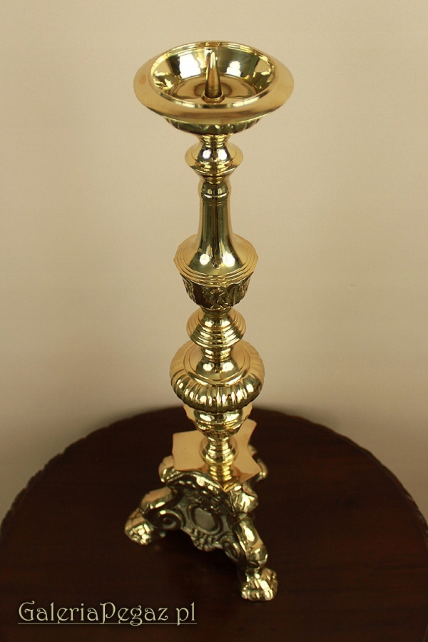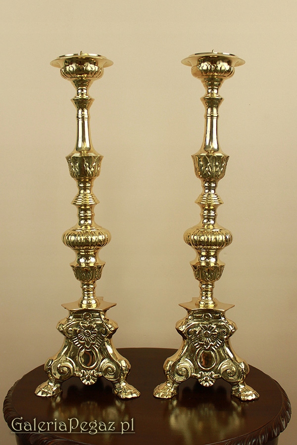 Пара великих золотих, латунних священних свічників, встановлених на тригранних ніжках.