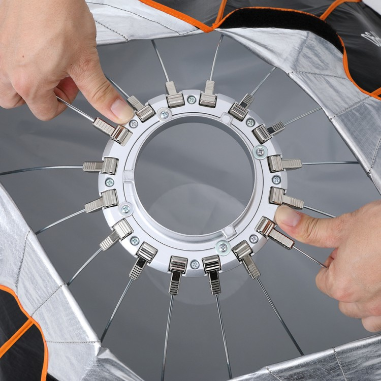 Завдяки інноваційній системі швидкого випуску, софтбокс встановлюється в спалах-просто підніміть дроти з кільця швидкості до тих пір, поки вони не клацають у відкрите положення, а розгортання займає лише кілька секунд. різкий і чітко визначений край, вдосконалення моделювання та деталі в портретах.