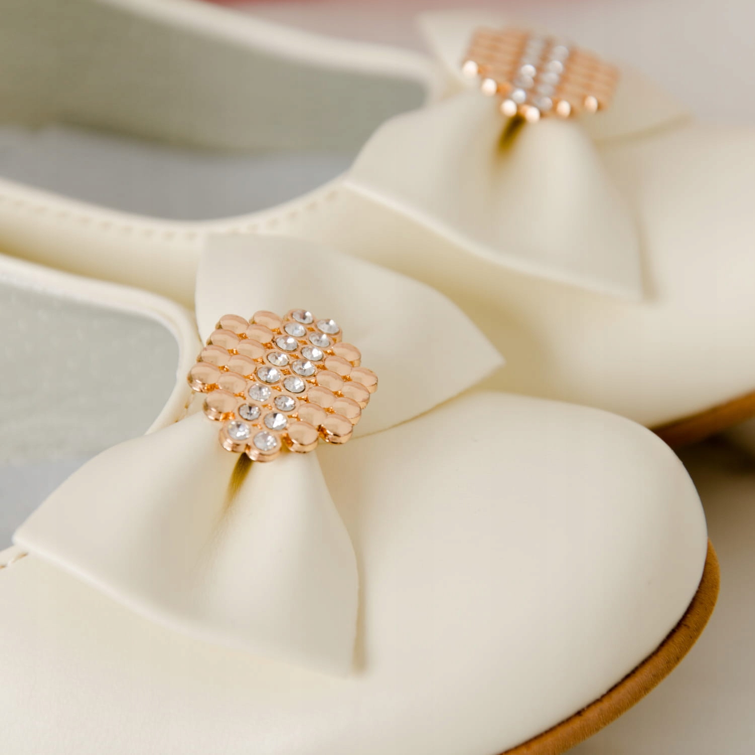Елегантне офіційне взуття кольору екрю для дівчаток. Взуття має гарну форму, тому надійно облягає ногу. Крім того, вони мають ремінець, який можна використовувати спереду для кращої підтримки стопи або ззаду як прикрасу. Модель має ніжний каблук висотою 1 см, сріблястого кольору. Красивий золотий бант додає їм шарму. Зовнішня частина взуття виготовлена з екологічної шкіри, а устілка - з натуральної шкіри. Класичні туфлі-балетки чудово підійдуть і як костюм для Першого Святого Причастя, і для інших урочистостей тощо.