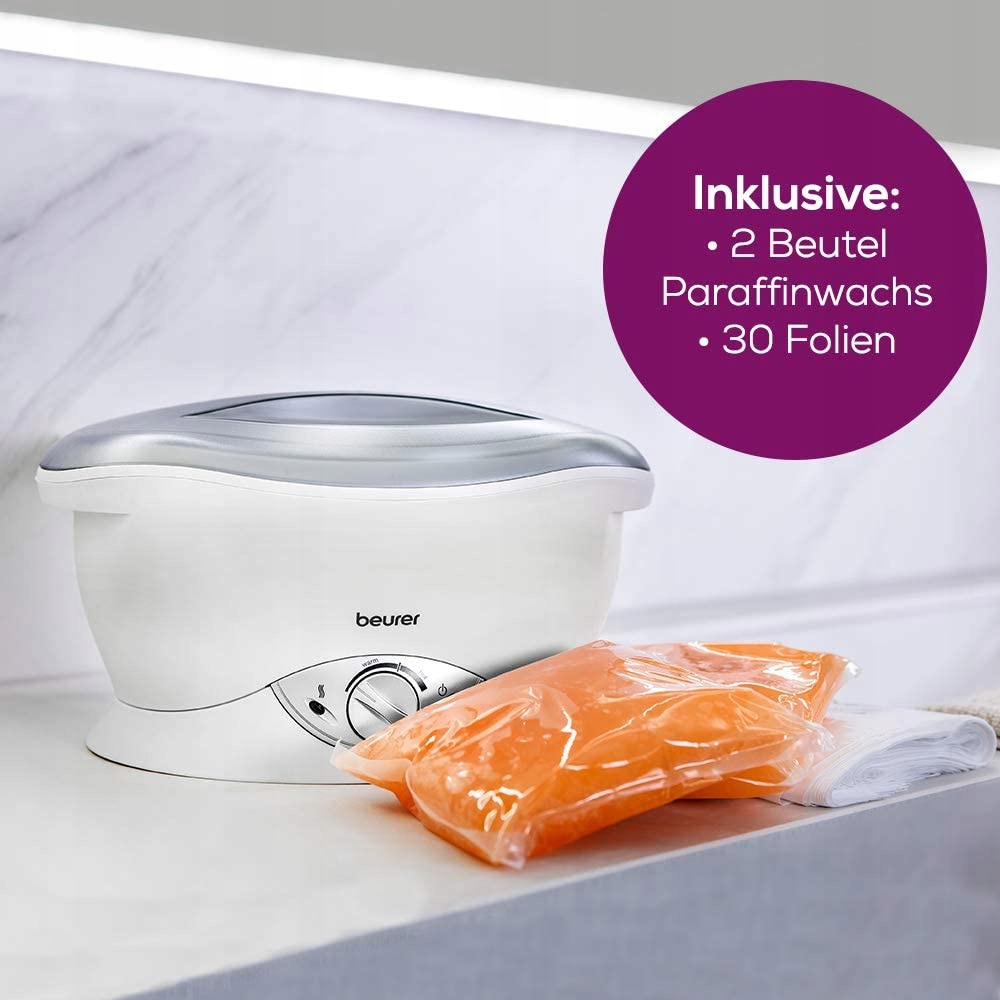 Ваночка для парафіну Beurer MP 70 - це пристрій для плавлення парафіну. Під час процедури сухі та шорсткі руки, ноги або лікті кілька разів занурюють у рідкий теплий парафін на декілька хвилин, а потім видаляють. Навколо оброблюваної частини тіла створюється тонкий шар воску, а поверх нього додатково накладається фольга. Тепло парафіну, що утворюється у ванні Beurer MP 70, розкриває пори шкіри та виділяє вологу. Завдяки восковому шару ця волога не зникає, а проникає через відкриті пори глибоко в шкіру, де вбирається. Догляд у ванні Beurer MP 70 робить шкіру особливо ніжною та оксамитовою. Через 20 хвилин парафін можна видалити з обробленої ділянки. Крім того, тепло від парафінової ванни Beurer MP 70 покращує кровообіг. Ця процедура забезпечує оптимальне поглинання поживних і зволожуючих речовин, а шкіра рук, ніг і ліктів стає пружною і м’якою.