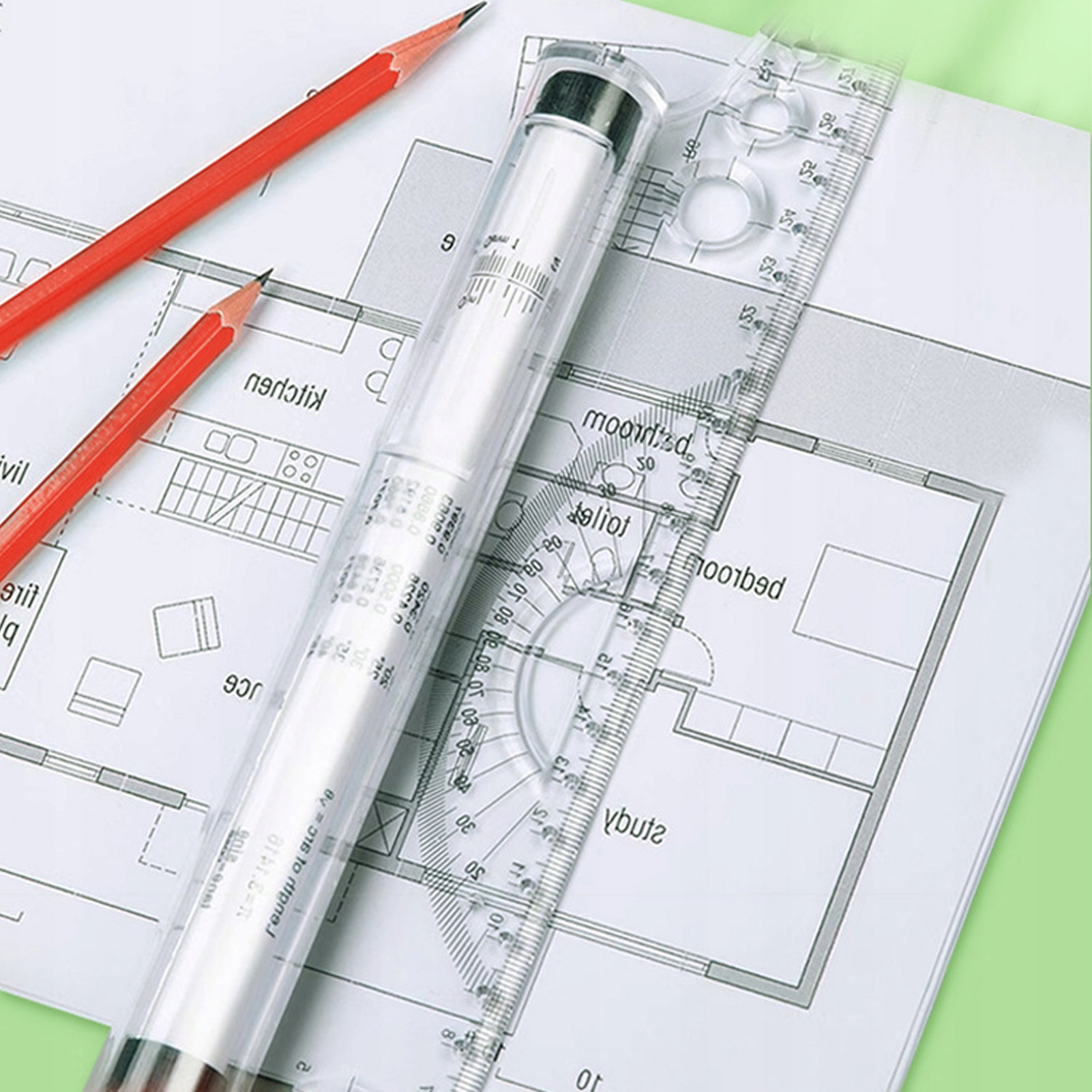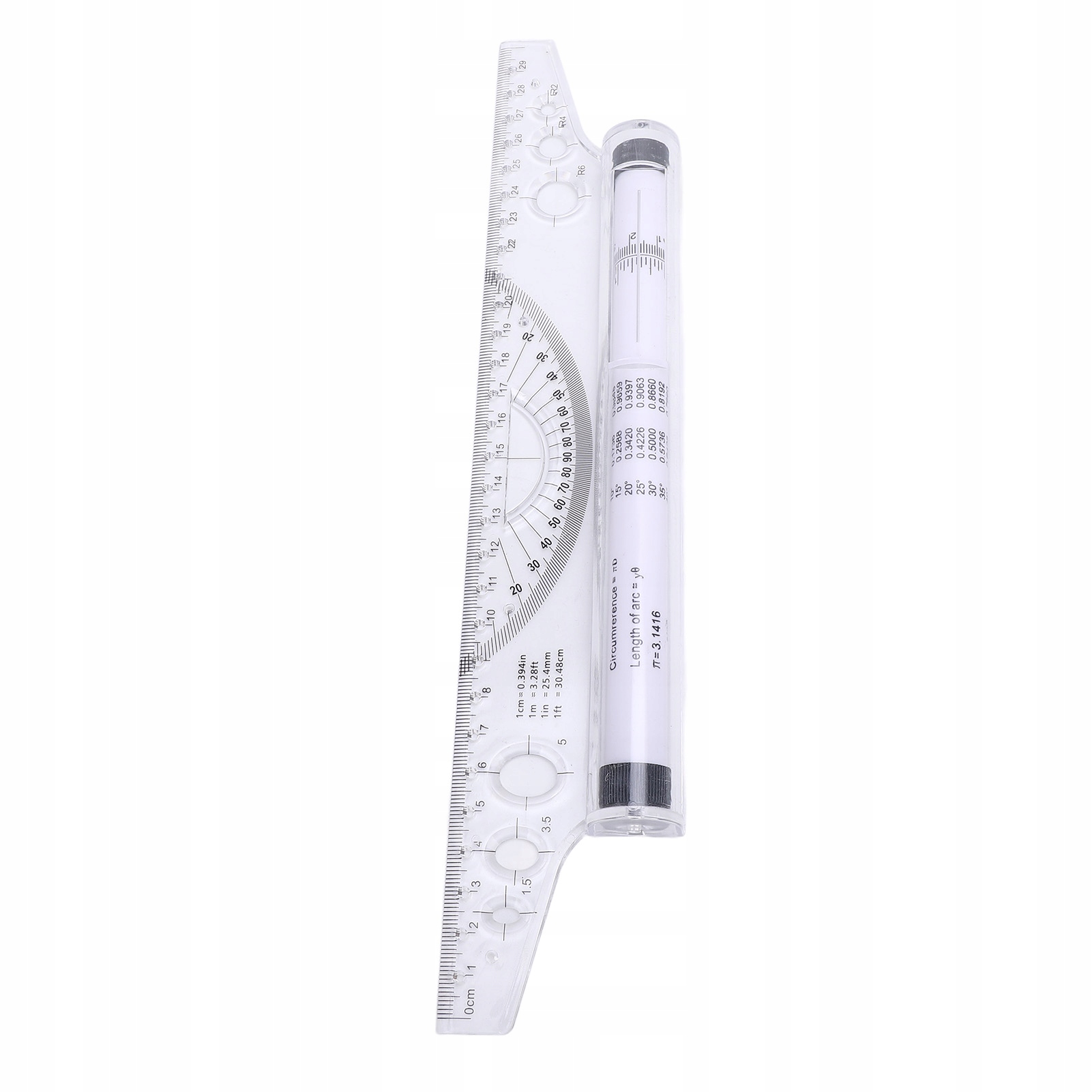 - Використання: вбудований транспортир для вимірювання кутів; Значення вимірювань на валику для малювання паралельної лінії на постійній відстані під час її руху по сторінці; Олівець для малювання дуг і кіл