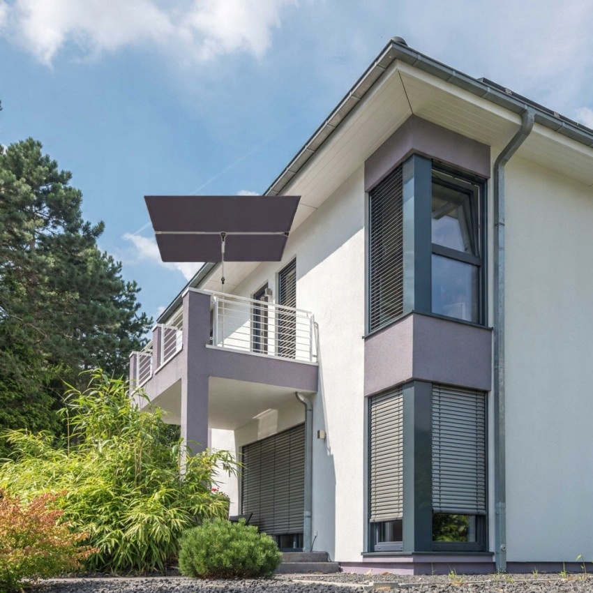 Сучасна прямокутна конструкція навісу щільно прилягає до стіни або перил, відділяючинас від післяобідньої спеки. Така ергономічна форма ідеально затемнює вибране місце, що не завжди можливо з круглою парасолькою.
